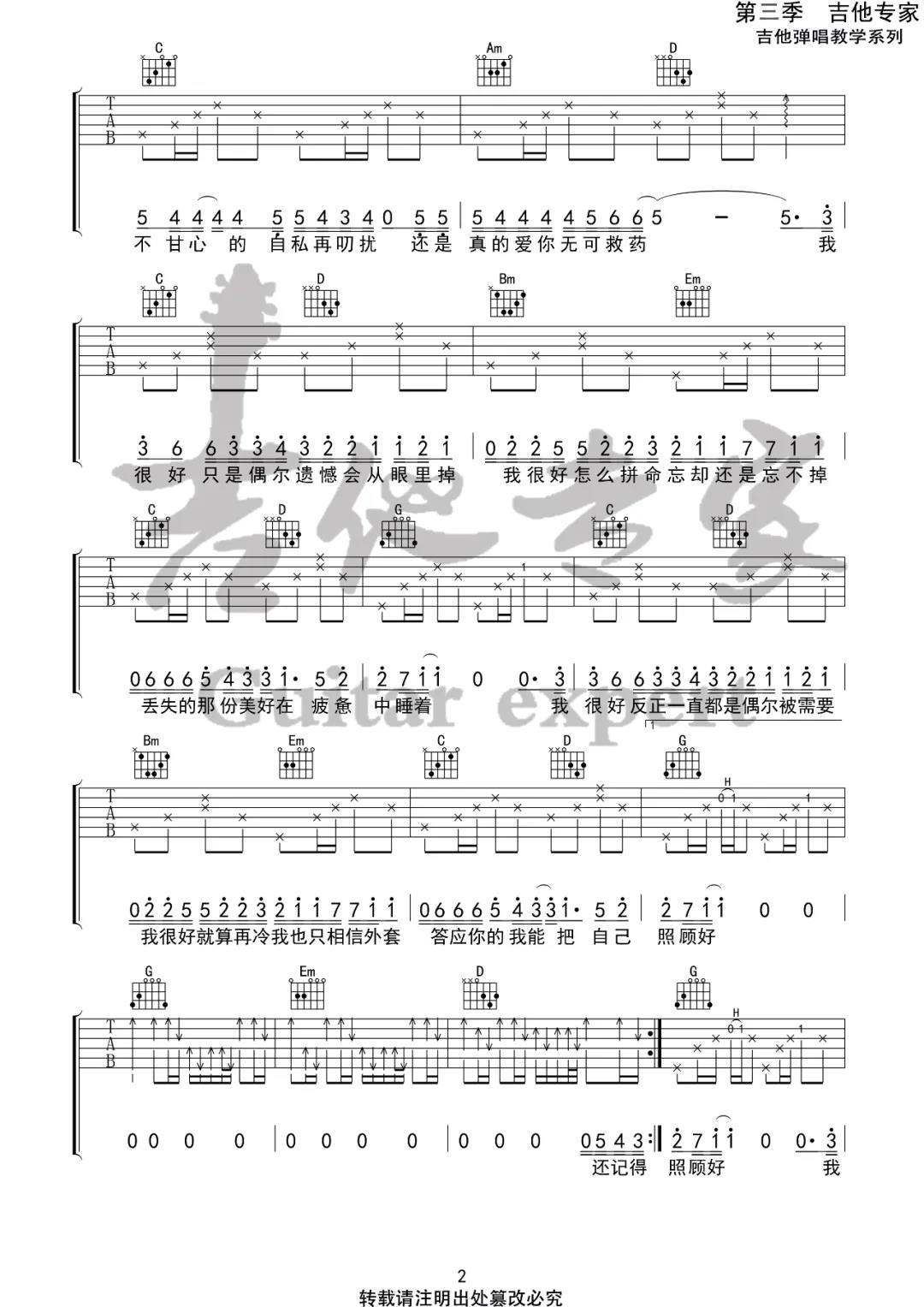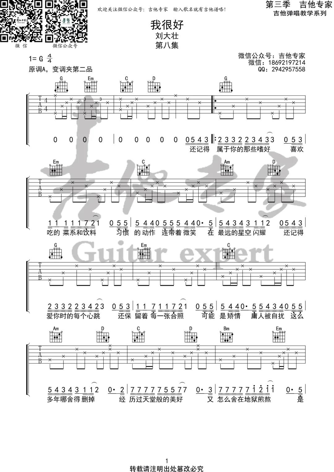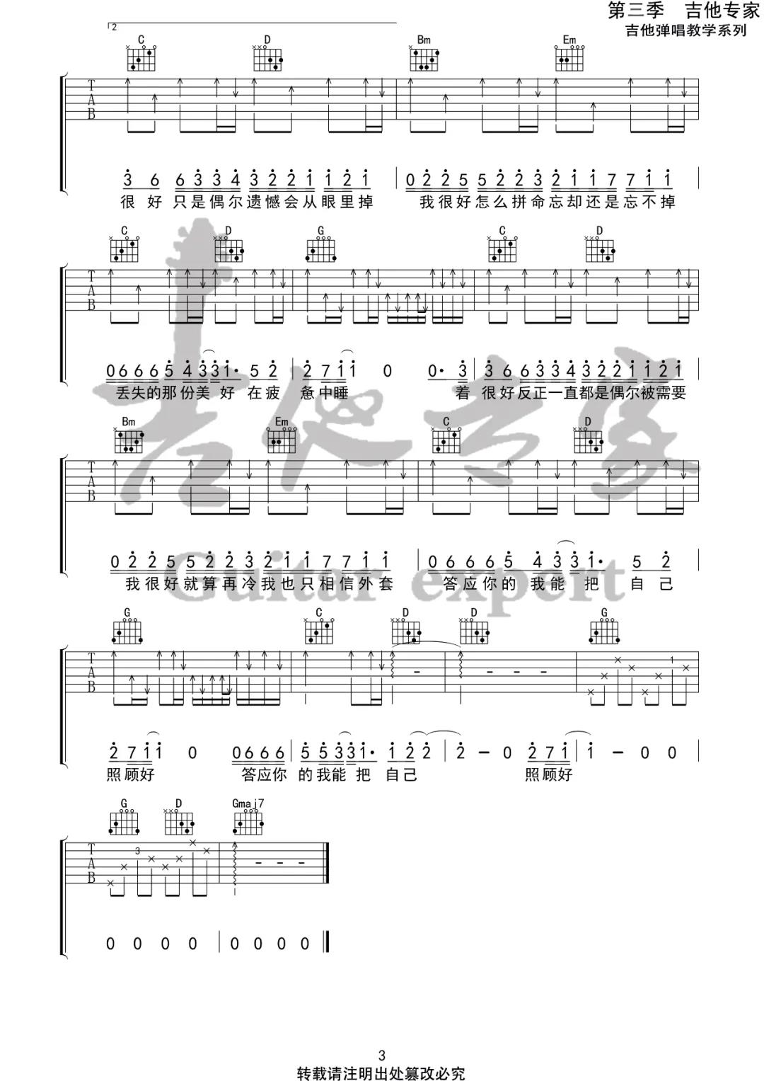 曲谱介绍: 刘大壮《我很好》吉他弹唱谱,采用G调指法编配,共有3张高清图谱。