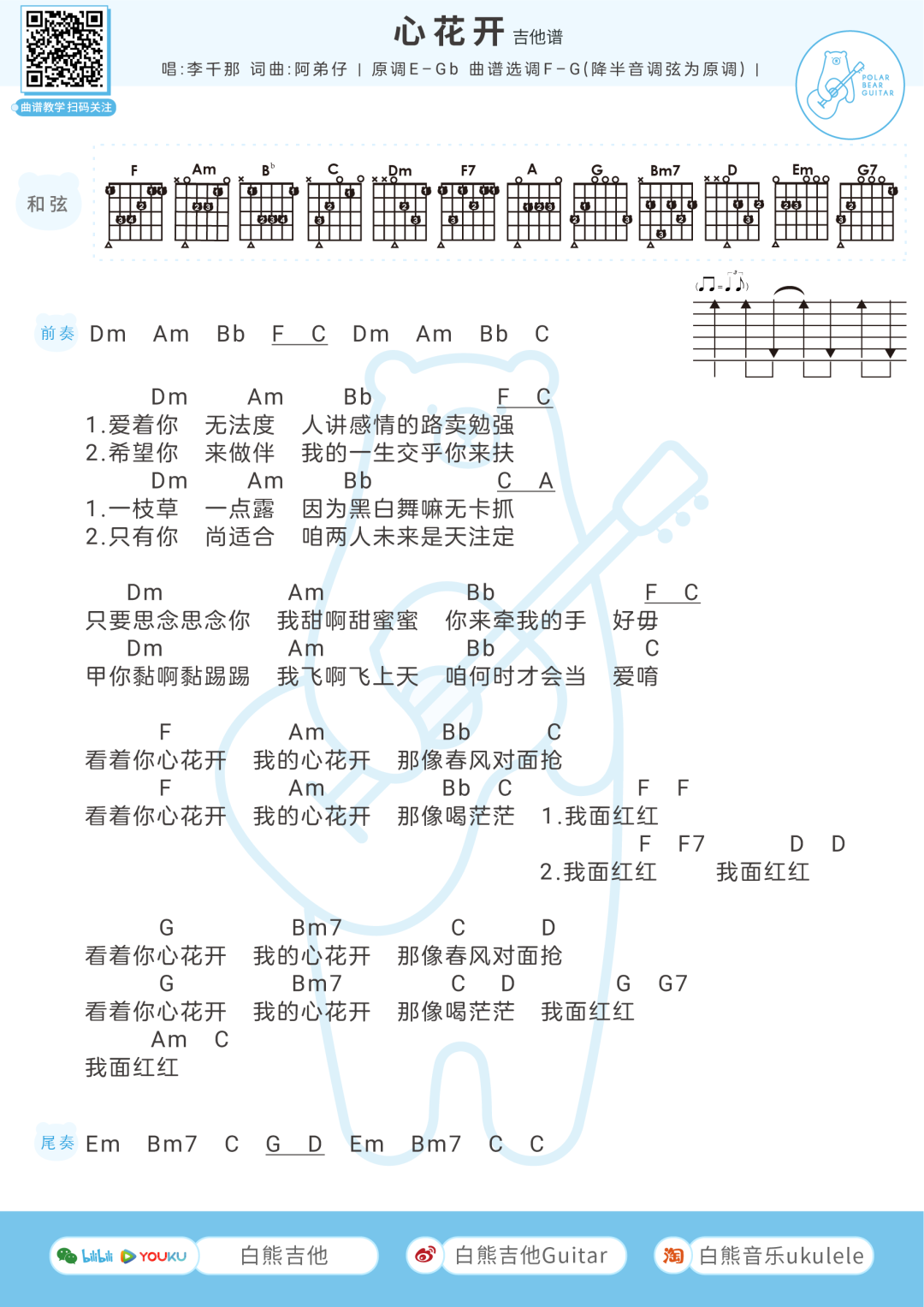曲谱介绍: 李千那《心花开》吉他弹唱谱,采用G调指法编配,共有1张高清图谱,免翻页排版设计。