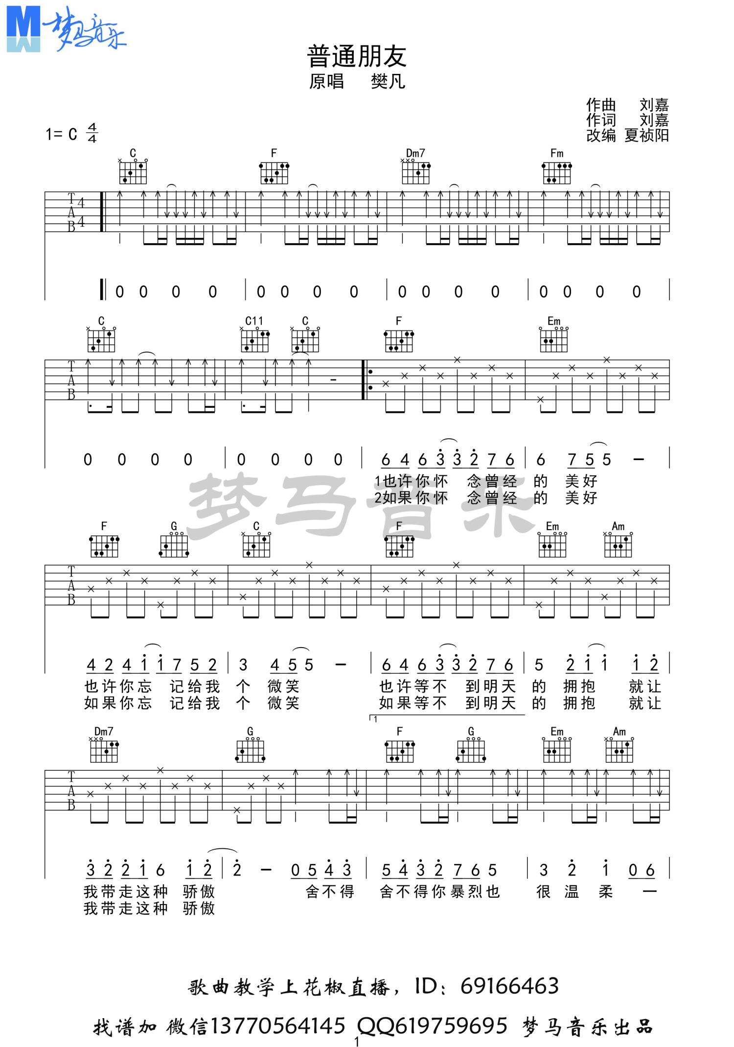 • 普通朋友吉他谱 - 樊凡 - C调吉他弹唱谱第1张