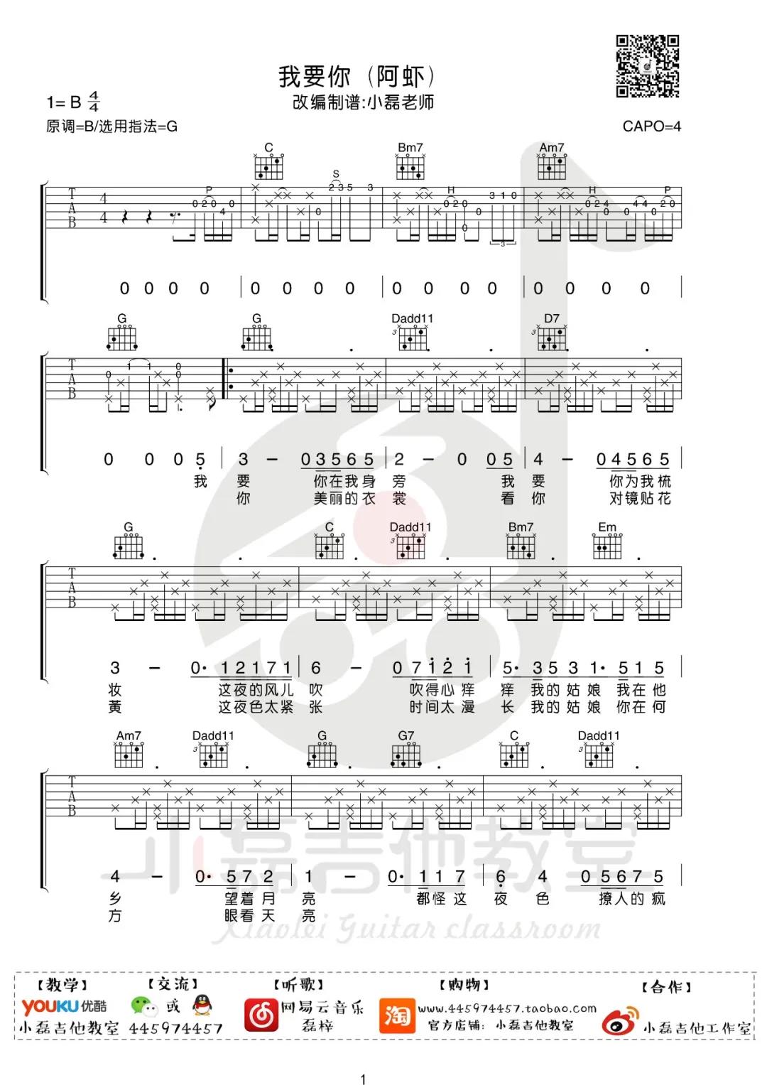 曲谱介绍: 阿虾《我要你》吉他弹唱谱,采用G调指法编配,共有3张高清图谱。