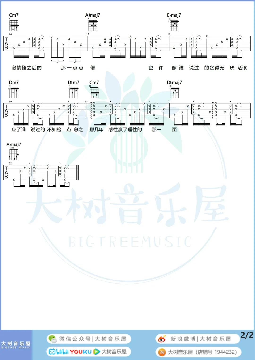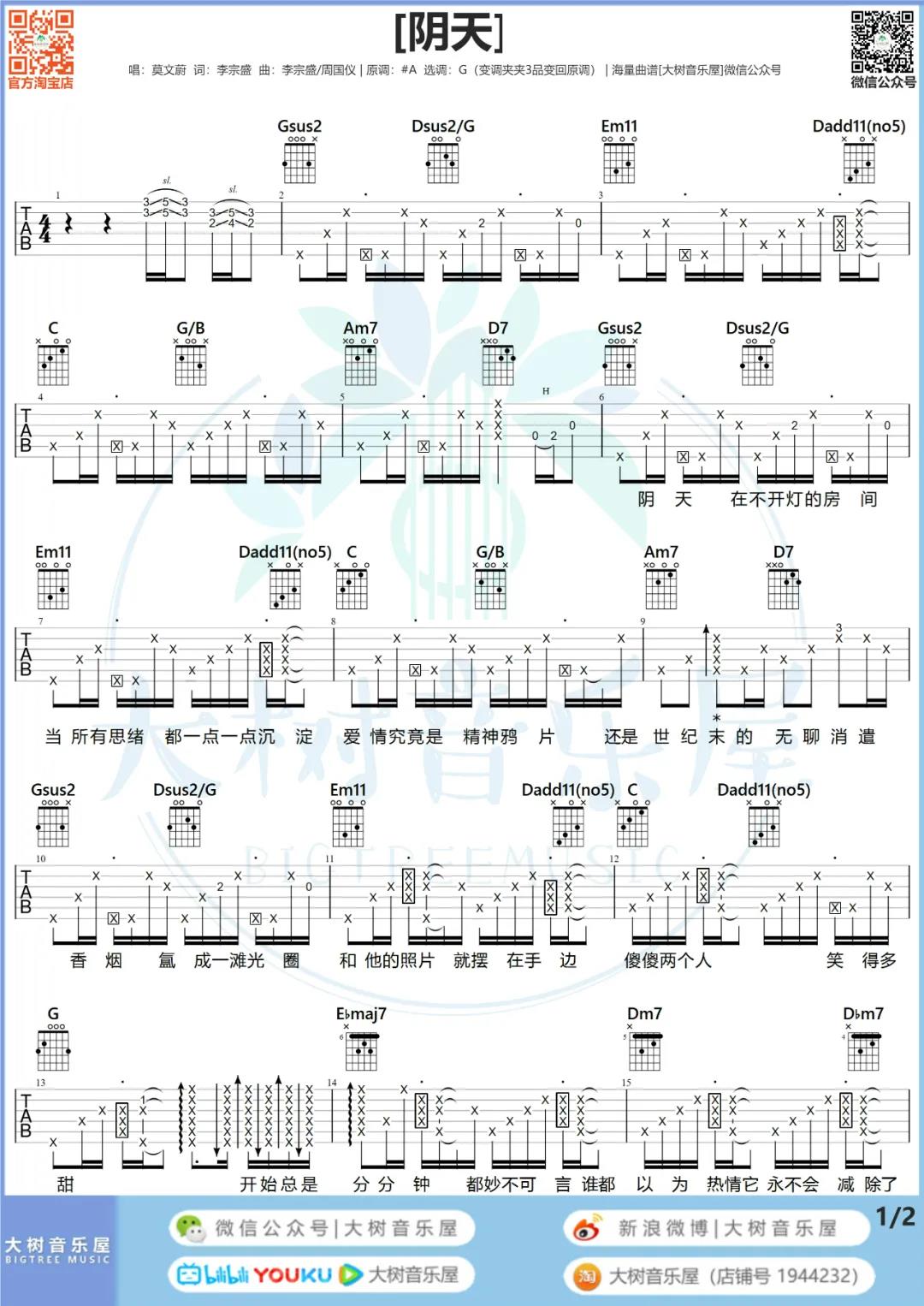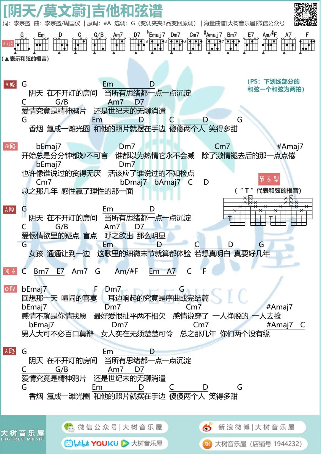 曲谱介绍: 莫文蔚《阴天》吉他弹唱谱,采用G调指法编配,共有3张高清图谱。