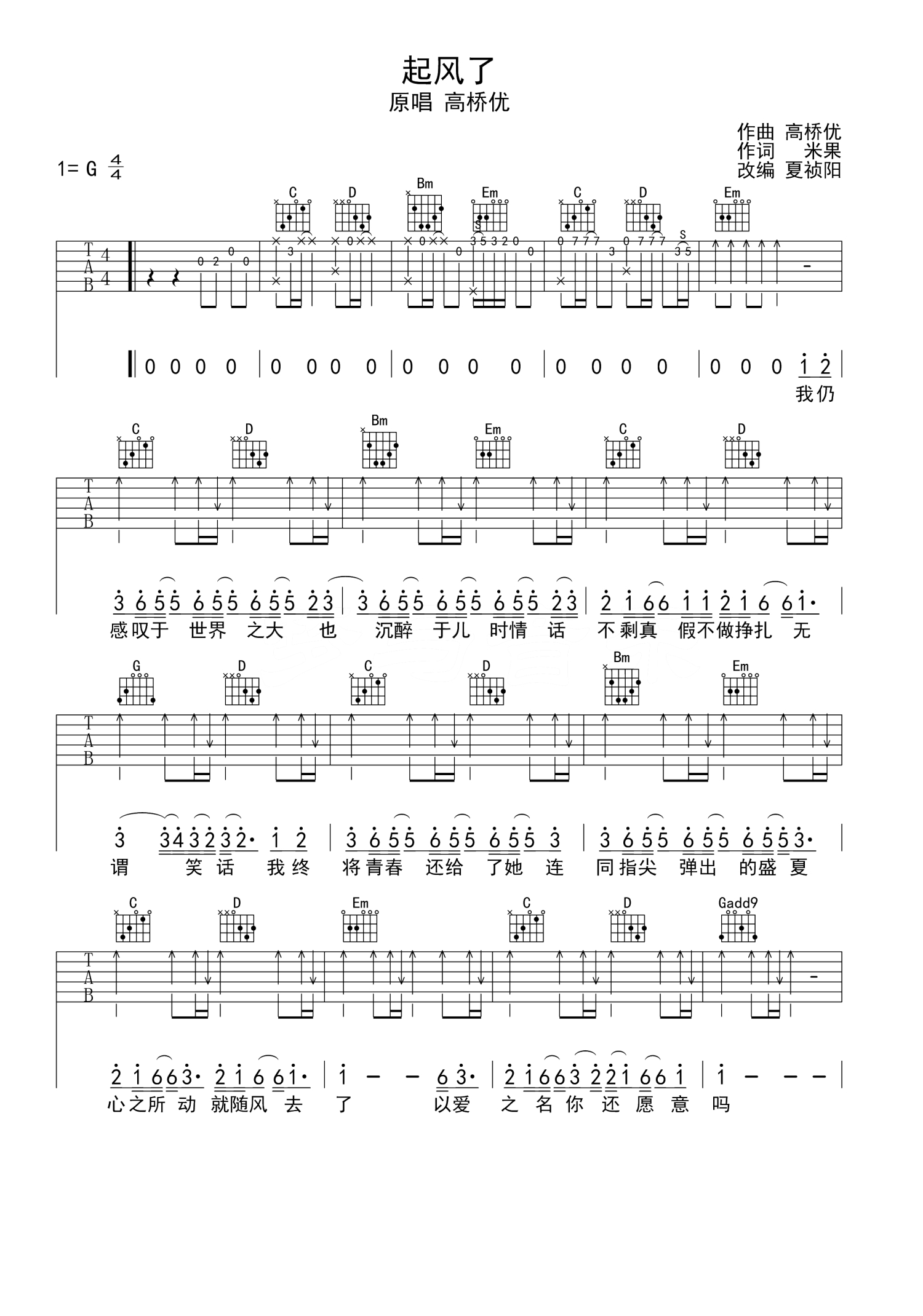 曲谱介绍: 高桥优《起风了》吉他谱_G调吉他弹唱谱