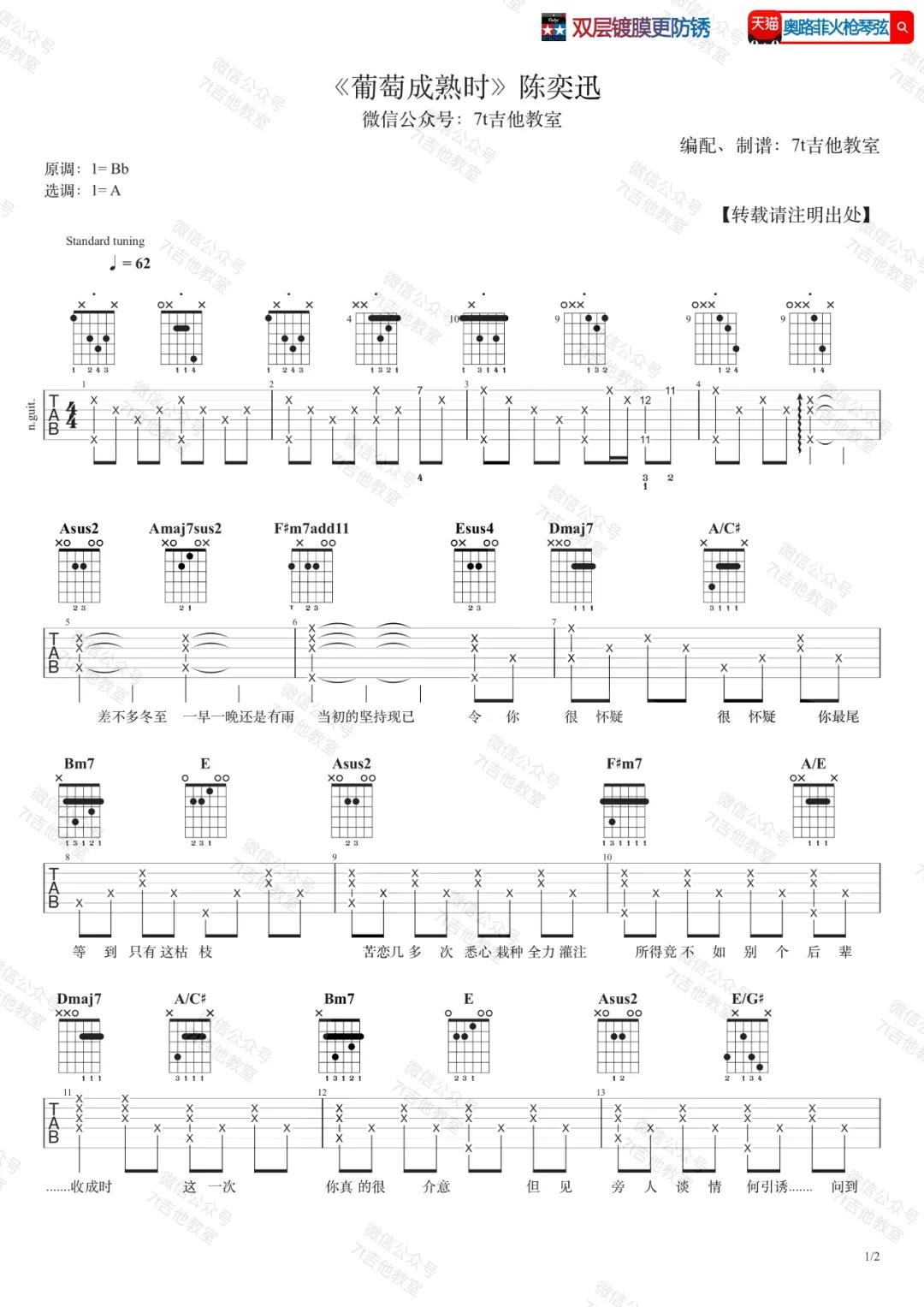 曲谱介绍: 陈奕迅《葡萄成熟时》吉他弹唱谱,采用A调指法编配,共有2张高清图谱,免翻页排版设计。