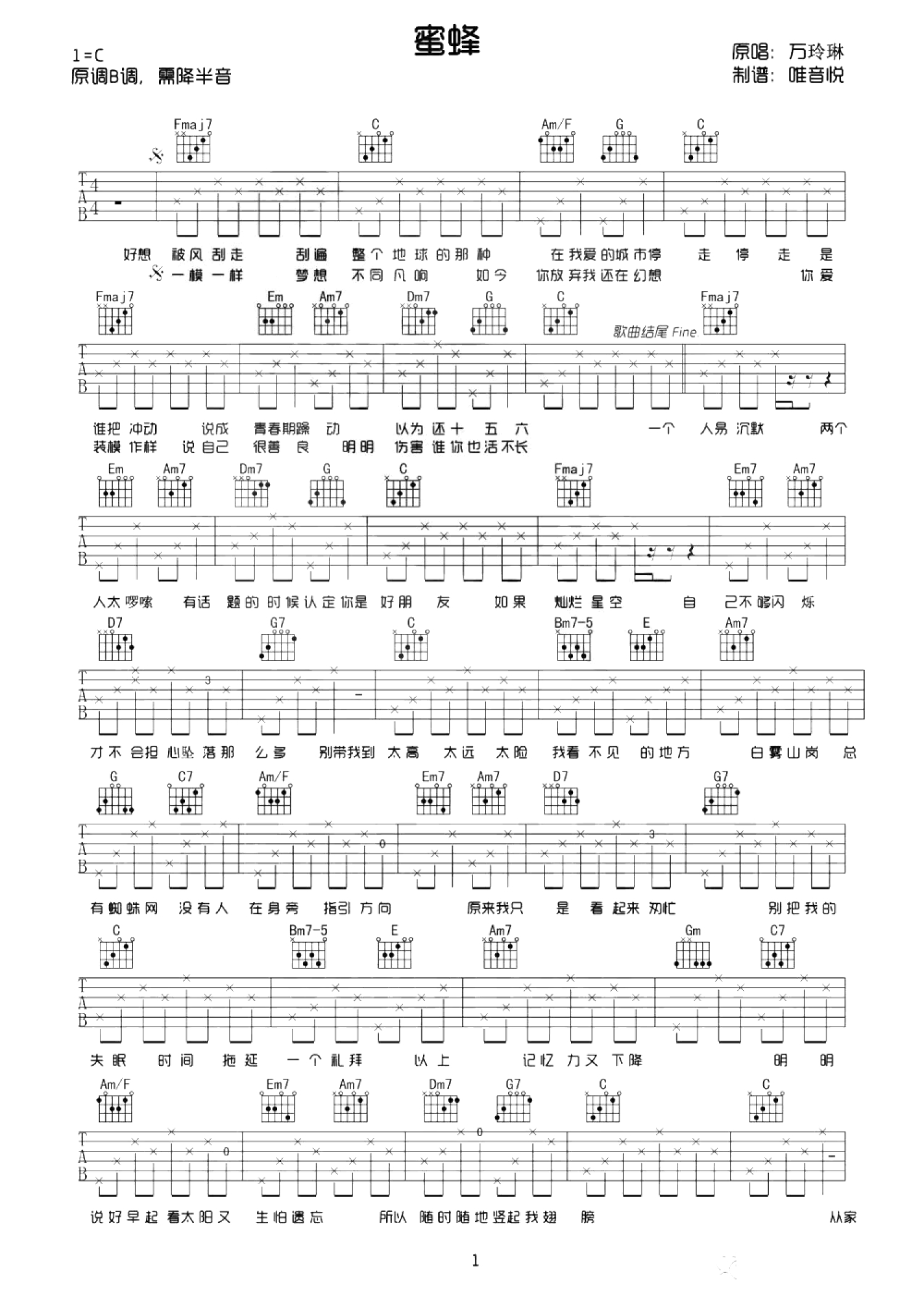蜜蜂吉他谱 - 万玲琳 - C调吉他弹唱谱