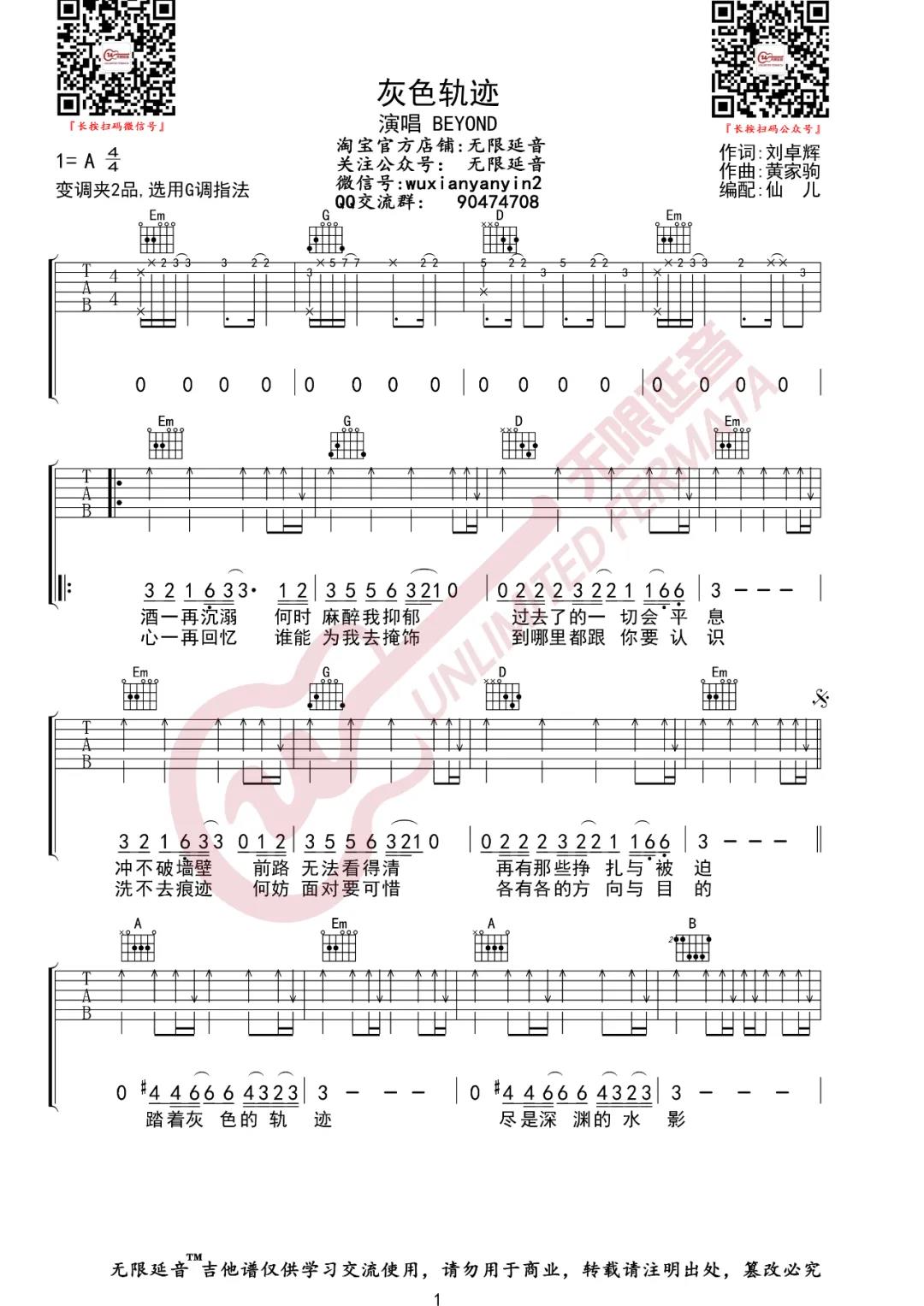 曲谱介绍: 《灰色轨迹》是由刘卓辉作词,黄家驹作曲,Beyond演唱的一首歌曲。已记不清有多少个孤独、失意的夜晚,一个人拿着磁带随身听在天台上听着beyond的歌曲。当熟悉的旋律一响起,内心的悲伤就像冰块遇到阳光很快被融化,整个人的思绪变得不再恍惚。其中,《灰色轨迹》所营造的意境和黄家驹悲怆沙哑的嗓音,让人有极强的代入感。里面歌词的内容看似迷茫无助,但歌曲所表达的信念却是坚定的,副歌最后一句:“不想你别去”点明了态度。 《灰色轨迹》这首歌是为配合电影《天若有情之追梦人》的剧情所创作,电影的原版编曲只有三分多钟,而大众所熟悉的版本则是1991年BEYOND生命接触演唱会重新编曲的。它在原来的基础上加入了后面的电吉他和纯木吉他的演奏,这段solo给人的感觉像是两把吉他在互相倾诉,凄厉悲怆,哀怨、痛苦、无奈,又体现出二者患难与共,琴瑟和鸣的和谐状态。