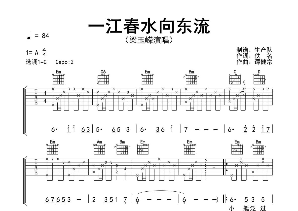 曲谱介绍: 梁玉嵘《一江春水向东流》吉他弹唱谱,采用G调指法编配精编完美版,生产队编配出品,共有2张高清图谱,免翻页排版设计。