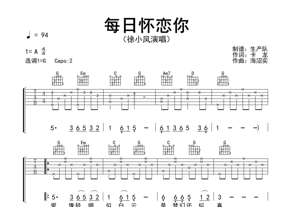 曲谱介绍: 徐小凤《每日怀恋你》吉他弹唱谱,采用G调指法编配精编完美版,生产队编配出品,共有3张高清图谱。