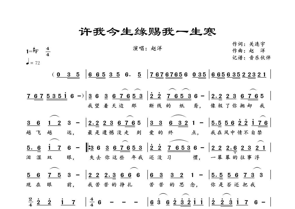 曲谱介绍: 赵洋《许我今生缘赐我一生寒》,音乐伙伴编配出品,共有1张高清图谱,免翻页排版设计。