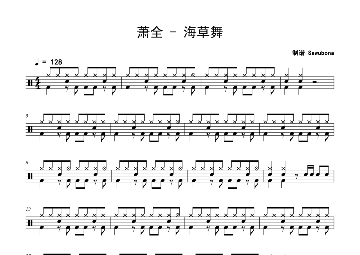 曲谱介绍: 萧全《海草舞》架子鼓谱,Sawubona编配出品,共有4张高清图谱。