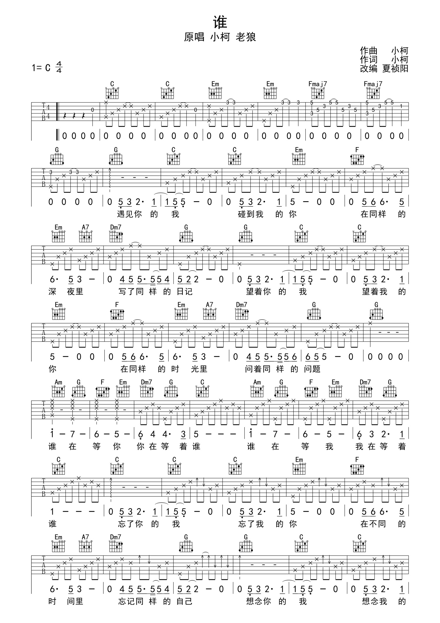 曲谱介绍: 廖俊涛/小柯/老狼《谁》吉他谱_C调吉他弹唱谱