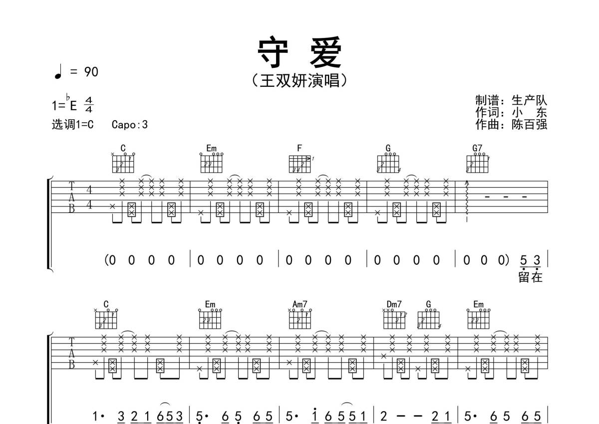 曲谱介绍: 王双妍《守爱》吉他弹唱谱,采用C调指法编配精编拍弦版,生产队编配出品,共有3张高清图谱。