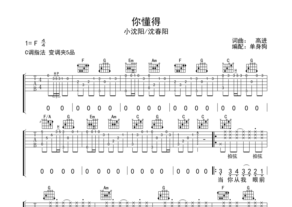 曲谱介绍: 小沈阳/沈春阳《你懂得》吉他弹唱谱,采用C调指法编配,单身狗编配出品,共有3张高清图谱。
