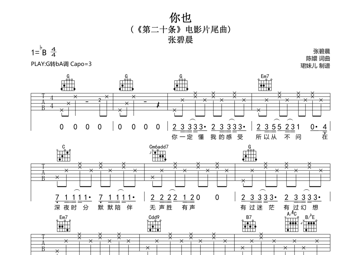 曲谱介绍: 张碧晨《你也》吉他弹唱谱,采用G调指法编配,珺妹儿编配出品,共有3张高清图谱。