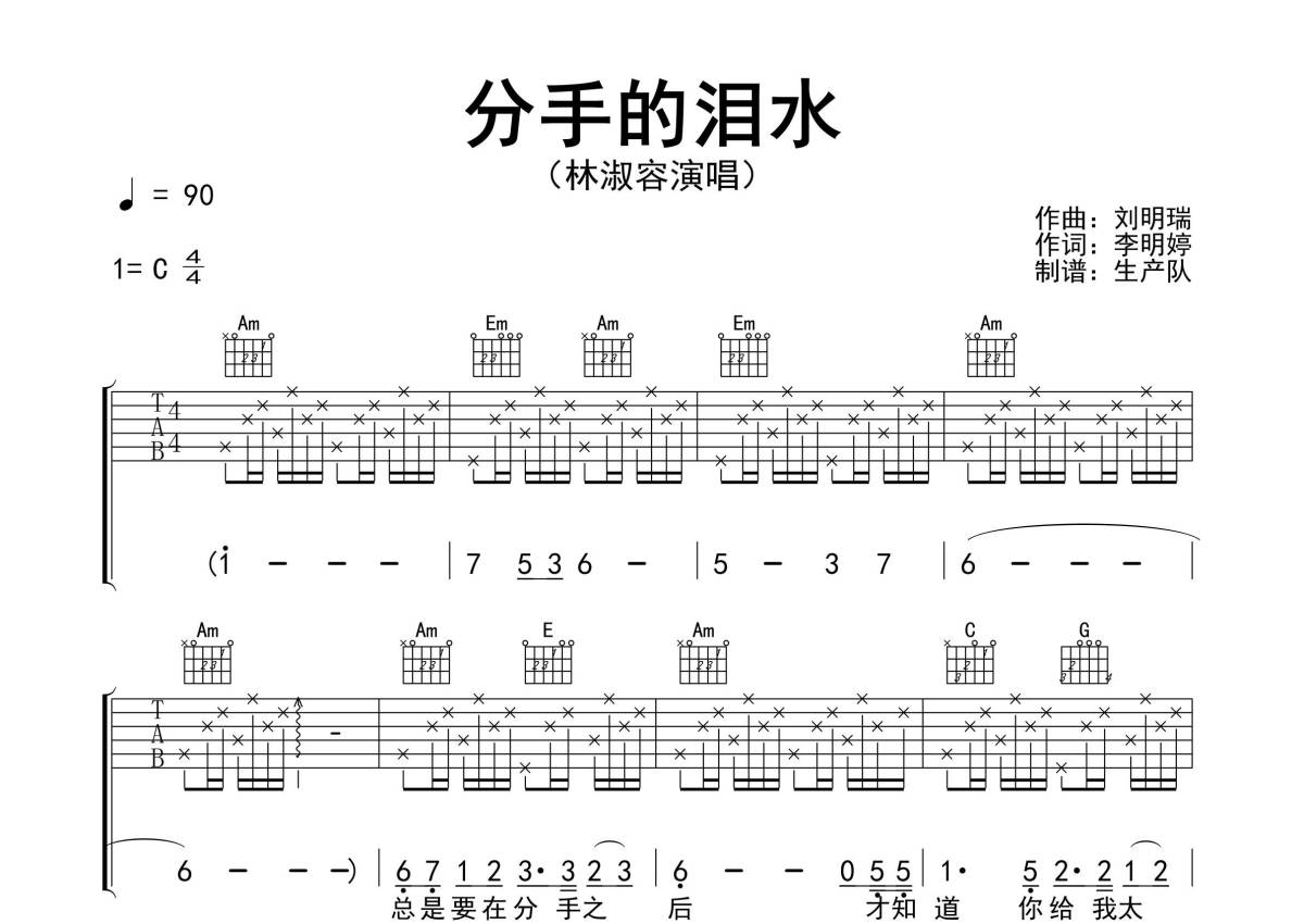 曲谱介绍: 林淑容《分手的泪水》吉他弹唱谱,采用C调指法编配精编完美版,生产队编配出品,共有3张高清图谱。