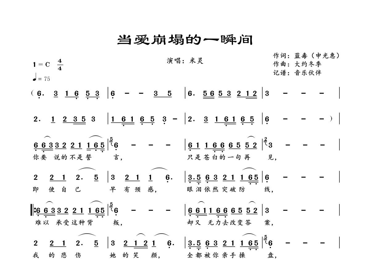 曲谱介绍: 米灵《当爱崩塌的一瞬间》,音乐伙伴编配出品,共有1张高清图谱,免翻页排版设计。