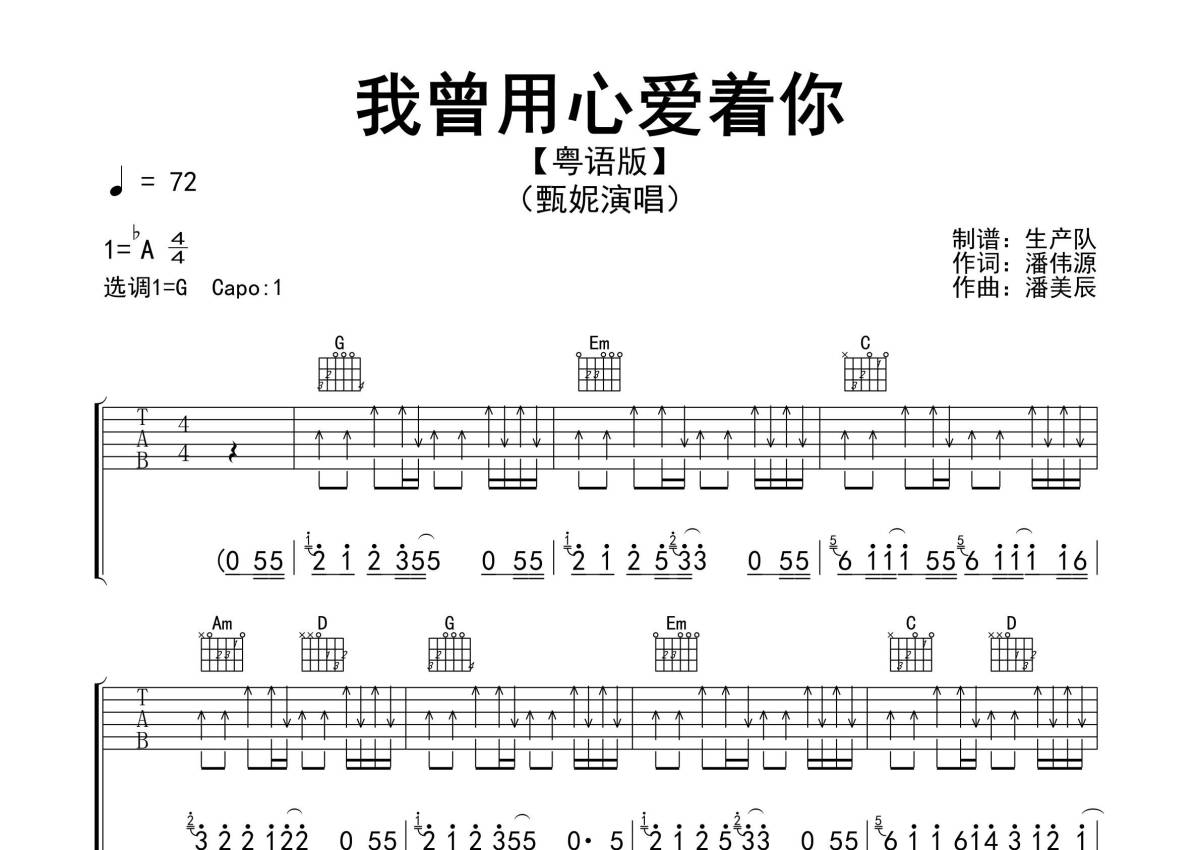 曲谱介绍: 粤语版《我曾用心爱着你(粤语版)》吉他弹唱谱,采用G调指法编配精编完美版,生产队编配出品,共有3张高清图谱。