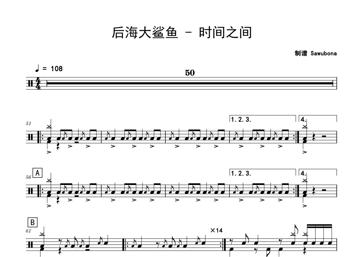 曲谱介绍: 后海大鲨鱼《时间之间》架子鼓谱,Sawubona编配出品,共有2张高清图谱,免翻页排版设计。