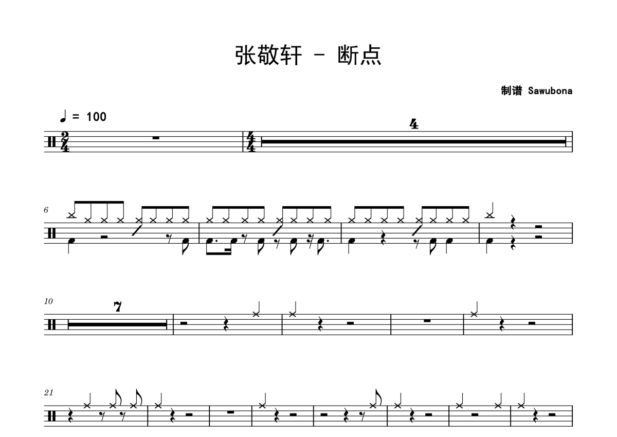 曲谱介绍: 张敬轩《断点》架子鼓谱,Sawubona编配出品,共有2张高清图谱,免翻页排版设计。