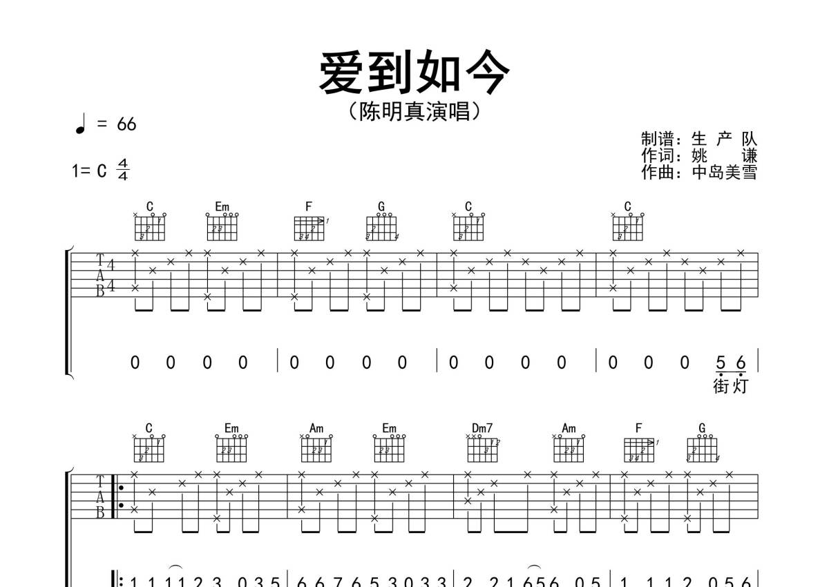 曲谱介绍: 陈明真《爱到如今》吉他弹唱谱,采用C调指法编配精编完美版,生产队编配出品,共有3张高清图谱。