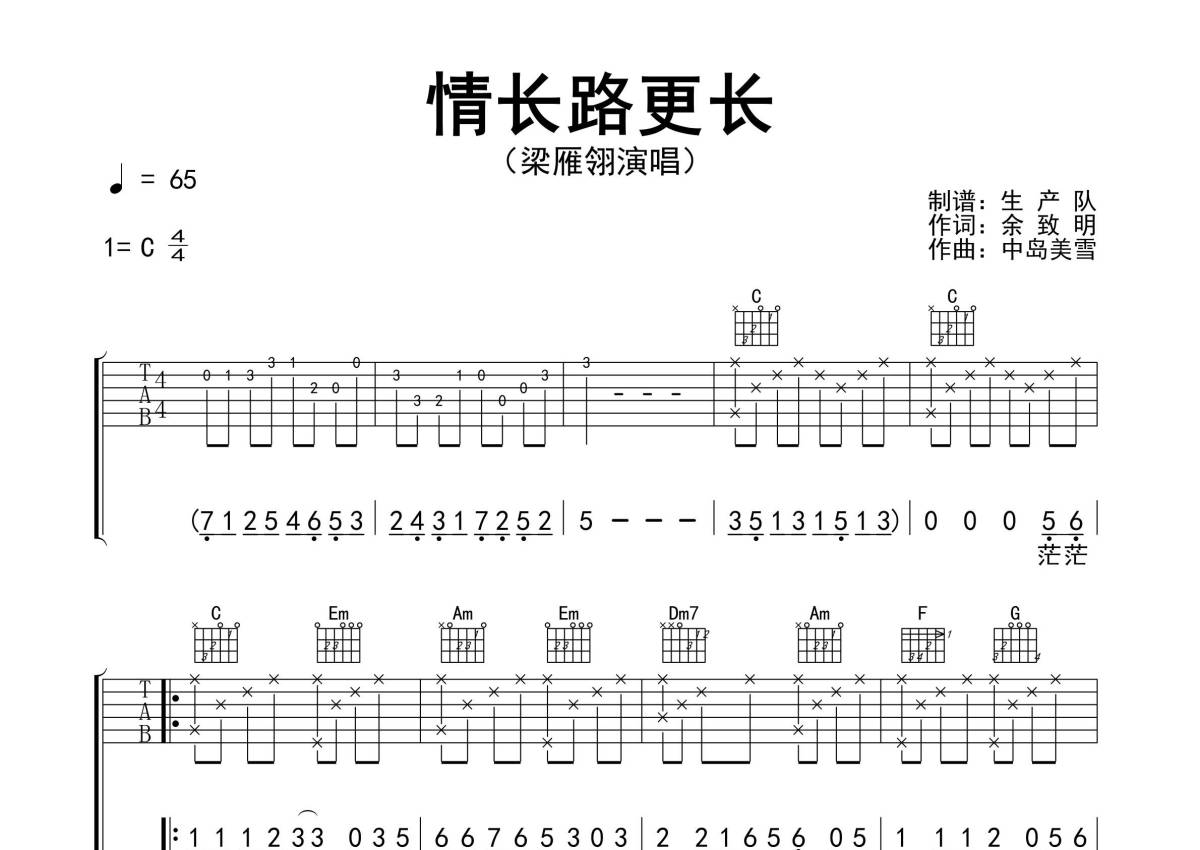 曲谱介绍: 梁雁翎《情长路更长》吉他弹唱谱,采用C调指法编配精编完美版,生产队编配出品,共有3张高清图谱。