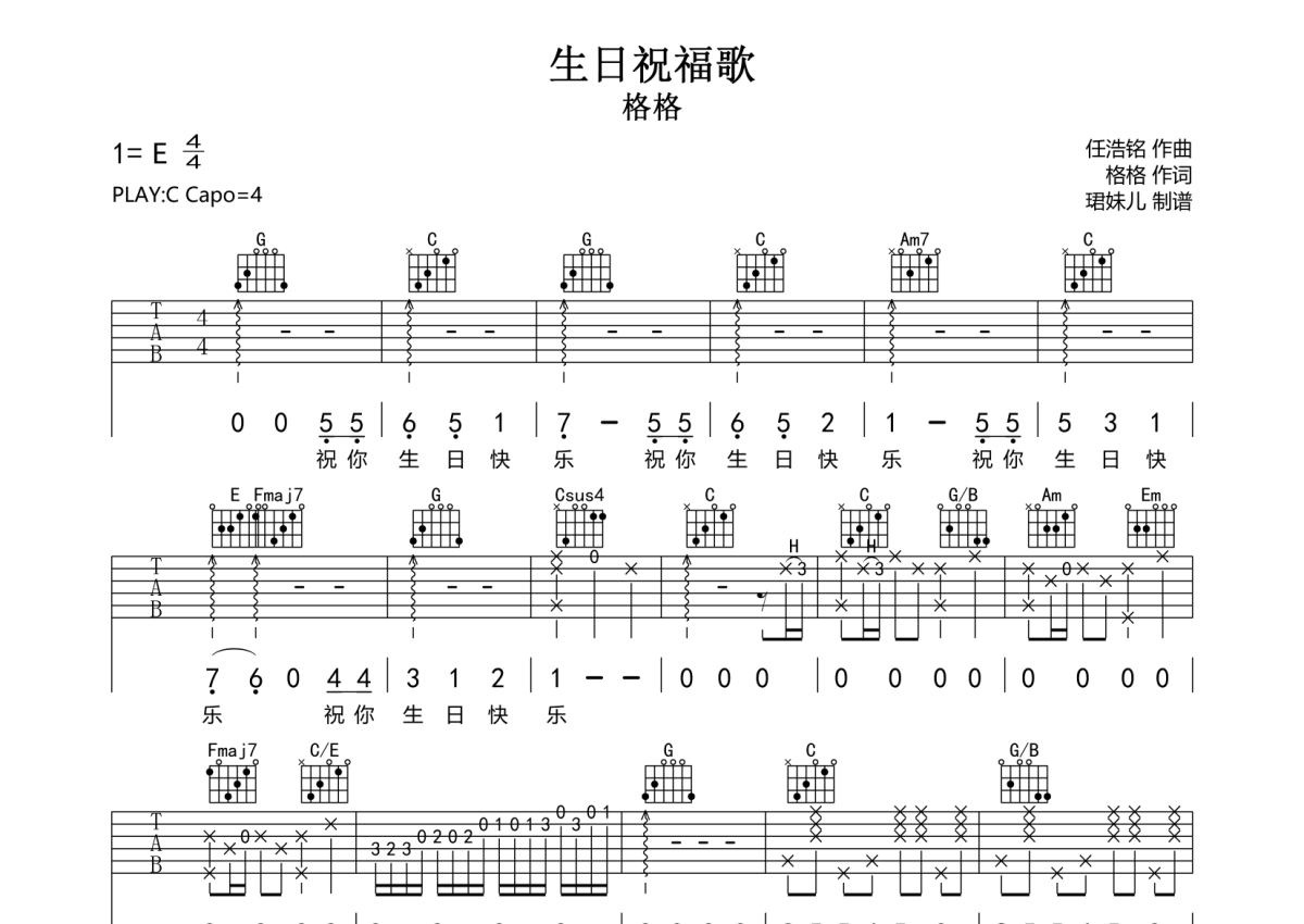 曲谱介绍: 格格《生日祝福歌》吉他弹唱谱,采用C调指法编配,珺妹儿编配出品,共有3张高清图谱。