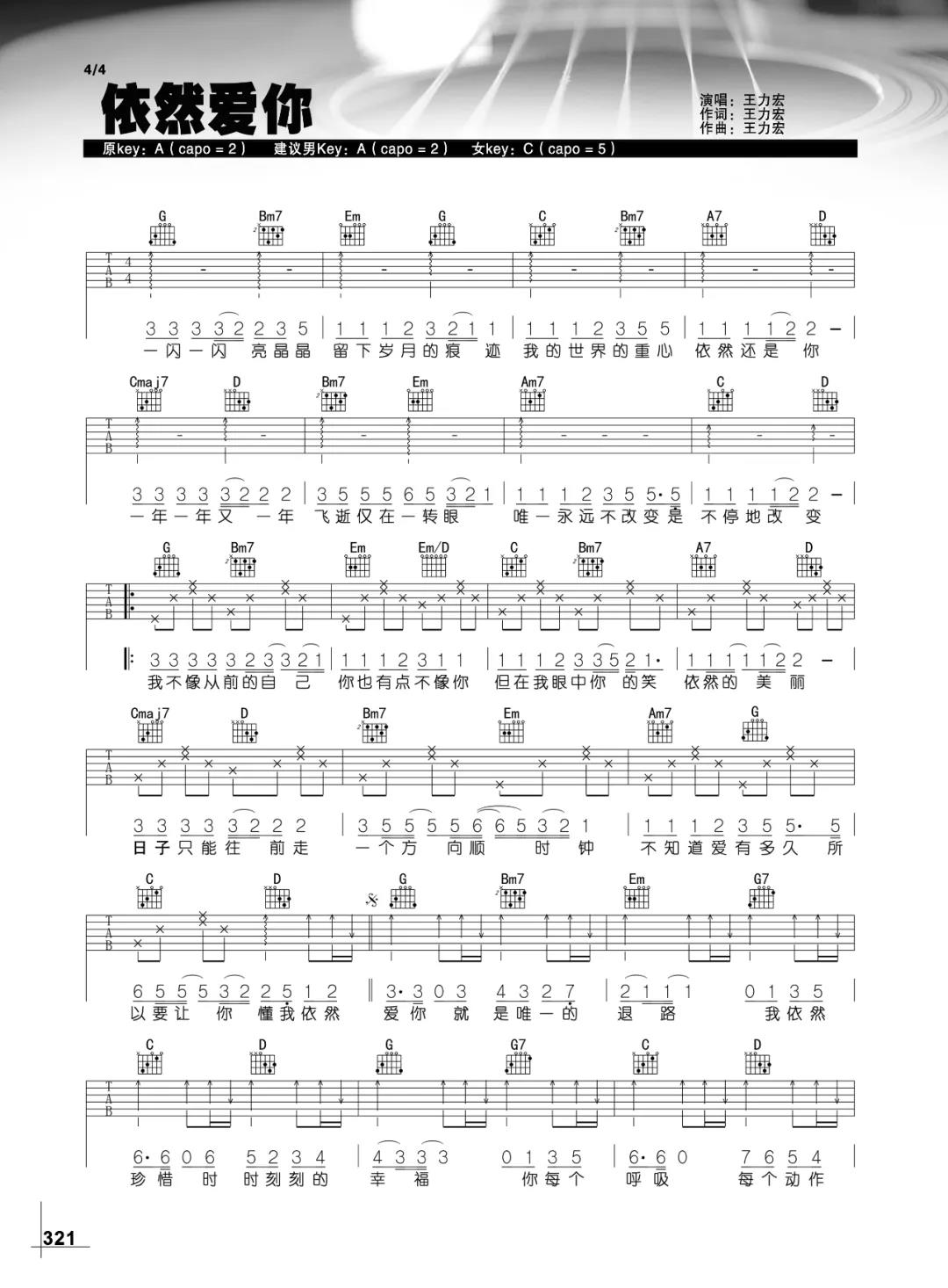曲谱介绍: 王力宏《依然爱你》吉他弹唱谱,采用A调指法编配,共有2张高清图谱,免翻页排版设计。