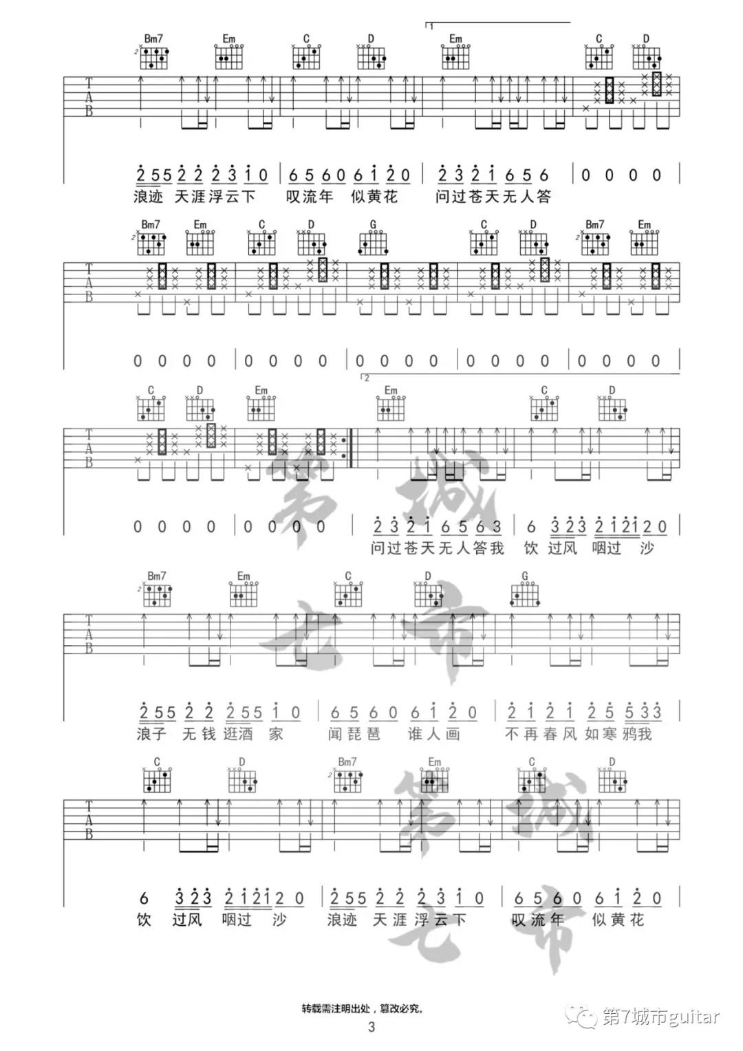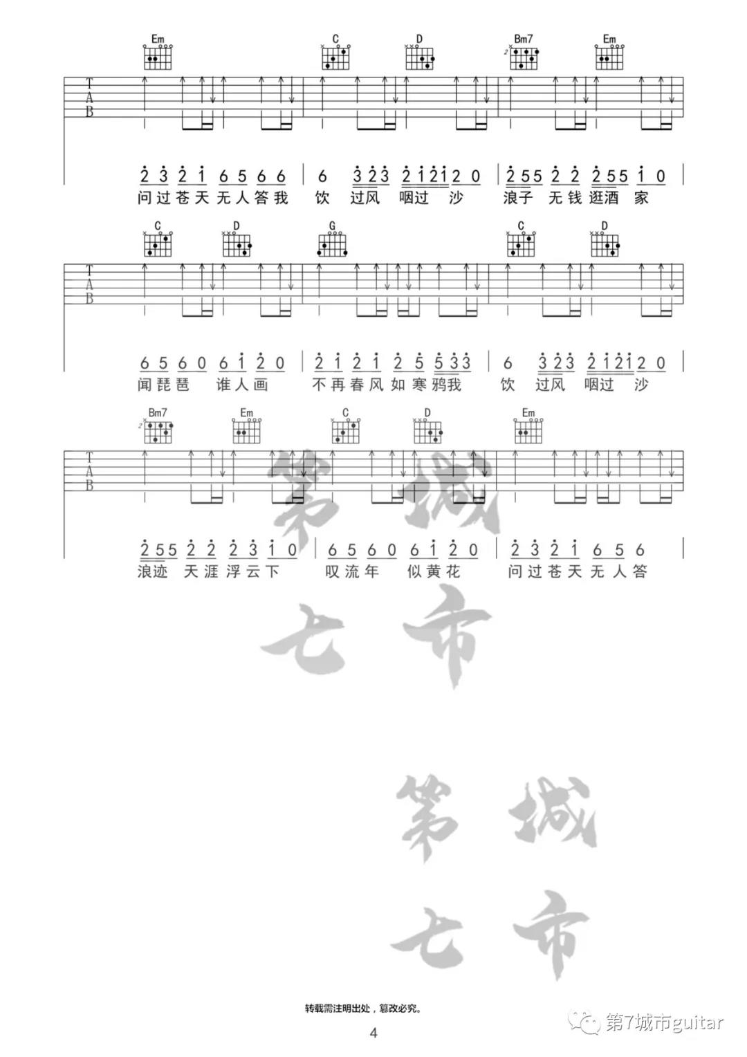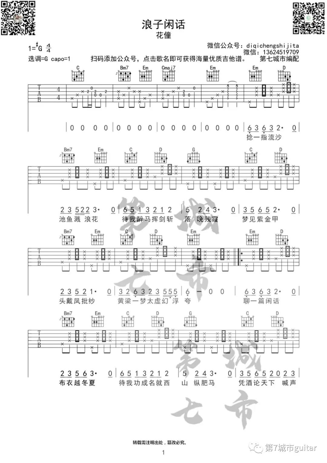 曲谱介绍: 花僮《浪子闲话》吉他弹唱谱,采用G调指法编配,共有4张高清图谱。