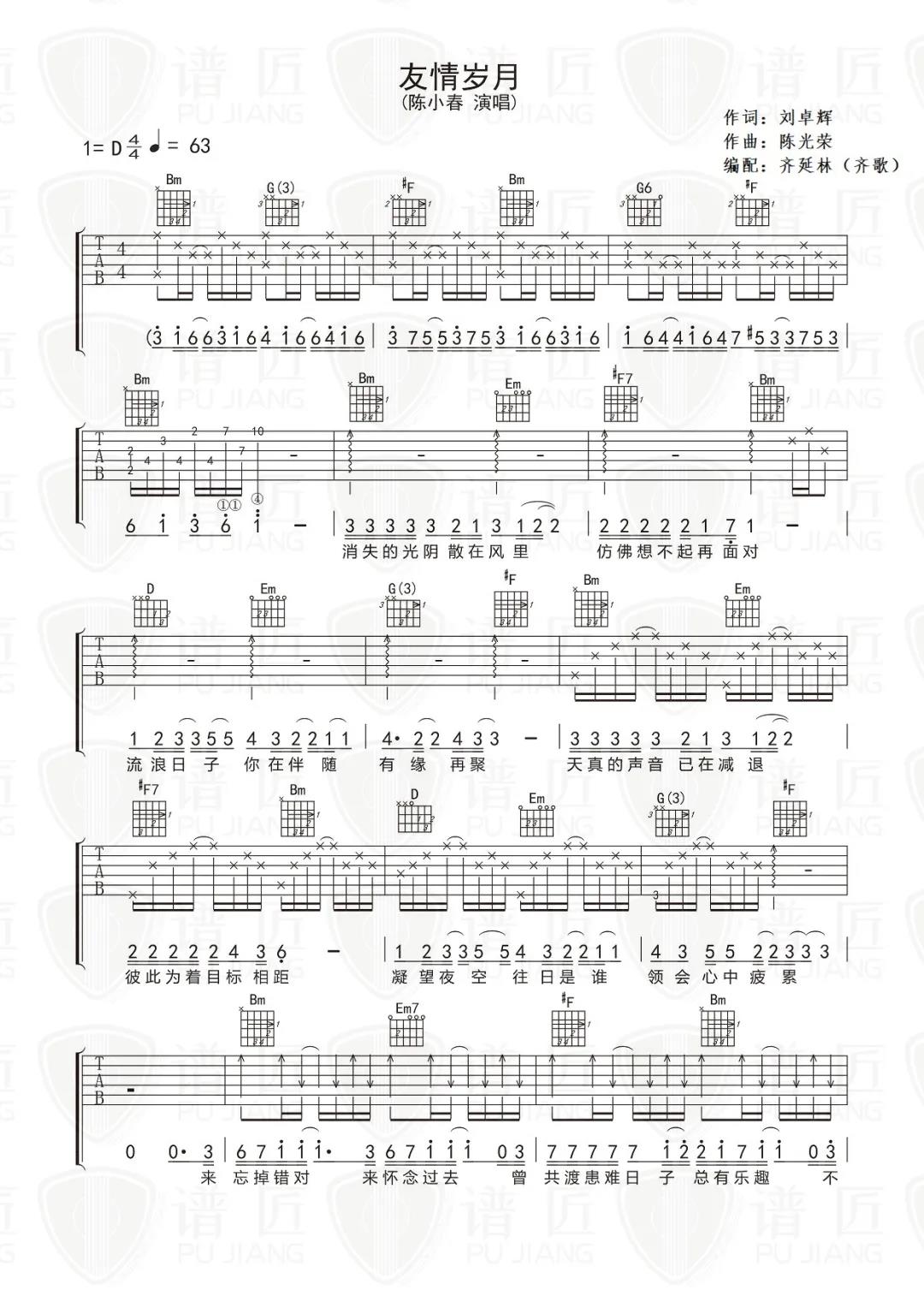 曲谱介绍: 陈小春《友情岁月》吉他弹唱谱,采用D调指法编配,共有2张高清图谱,免翻页排版设计。