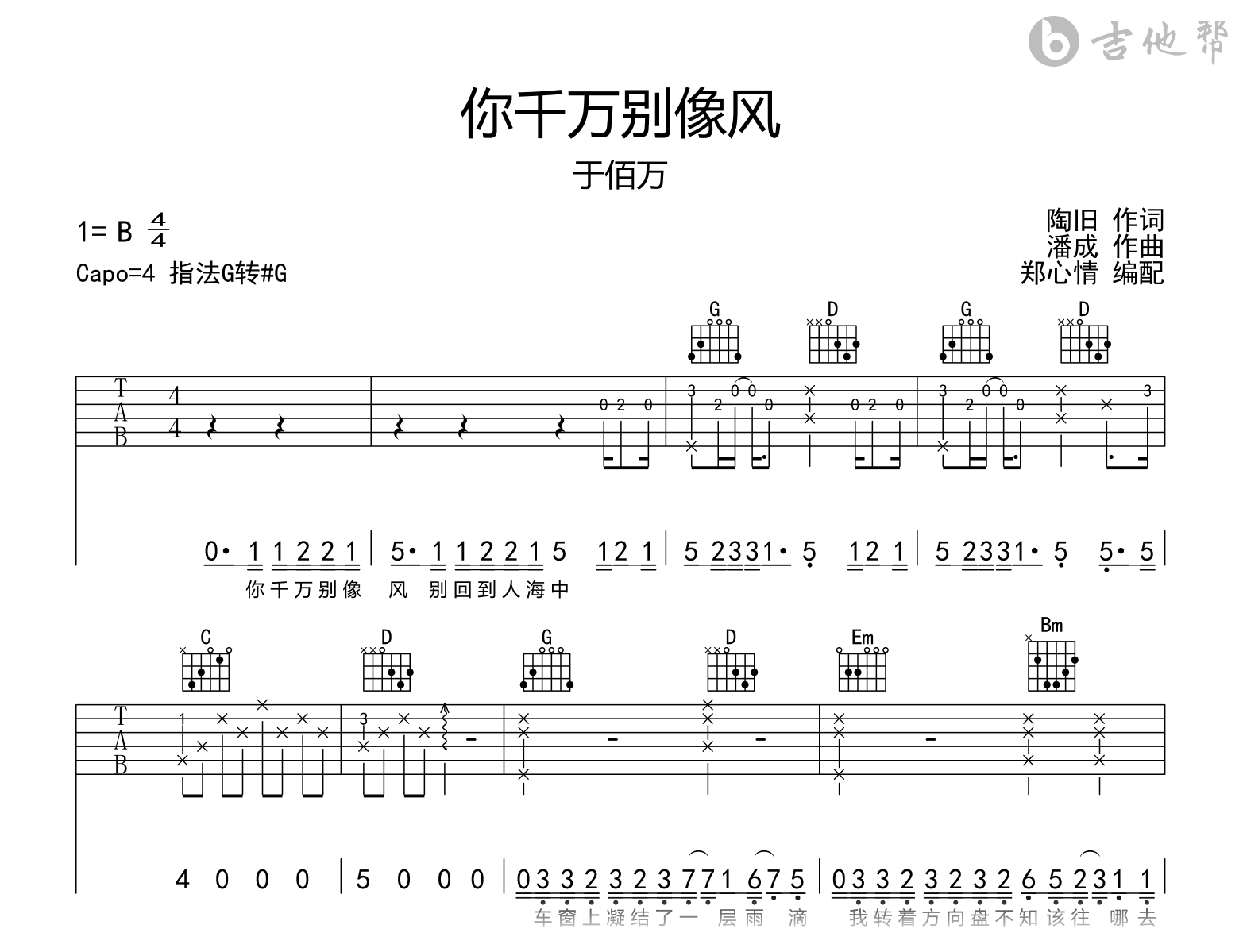 曲谱介绍: 你千万别像风吉他谱,于佰万演唱,你千万别像风,别又回到人海中,有些梦始终会落空。《你千万别像风》吉他弹唱谱,原调B,选用G转#G调指法编配,原调为B转C调,变调夹夹第4品。