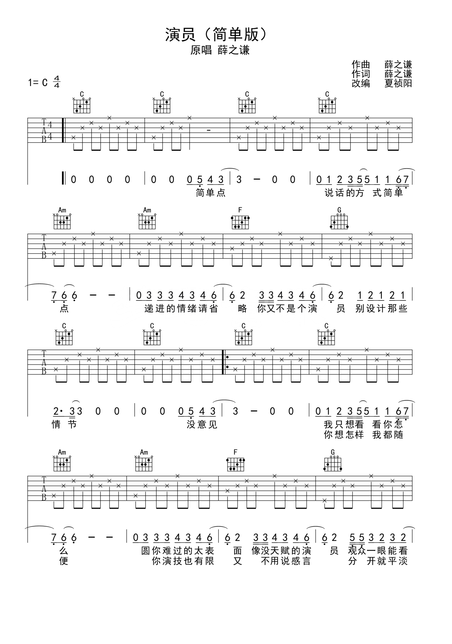 曲谱介绍: 薛之谦《演员》吉他谱_C调吉他弹唱谱_简单版