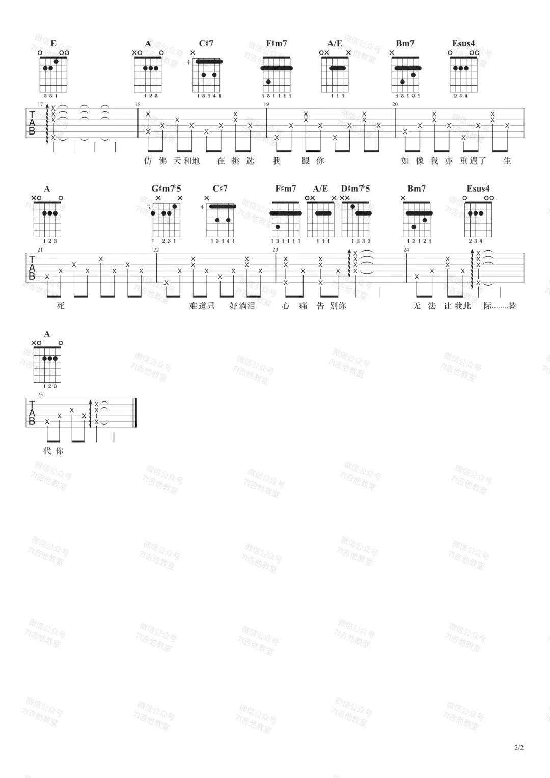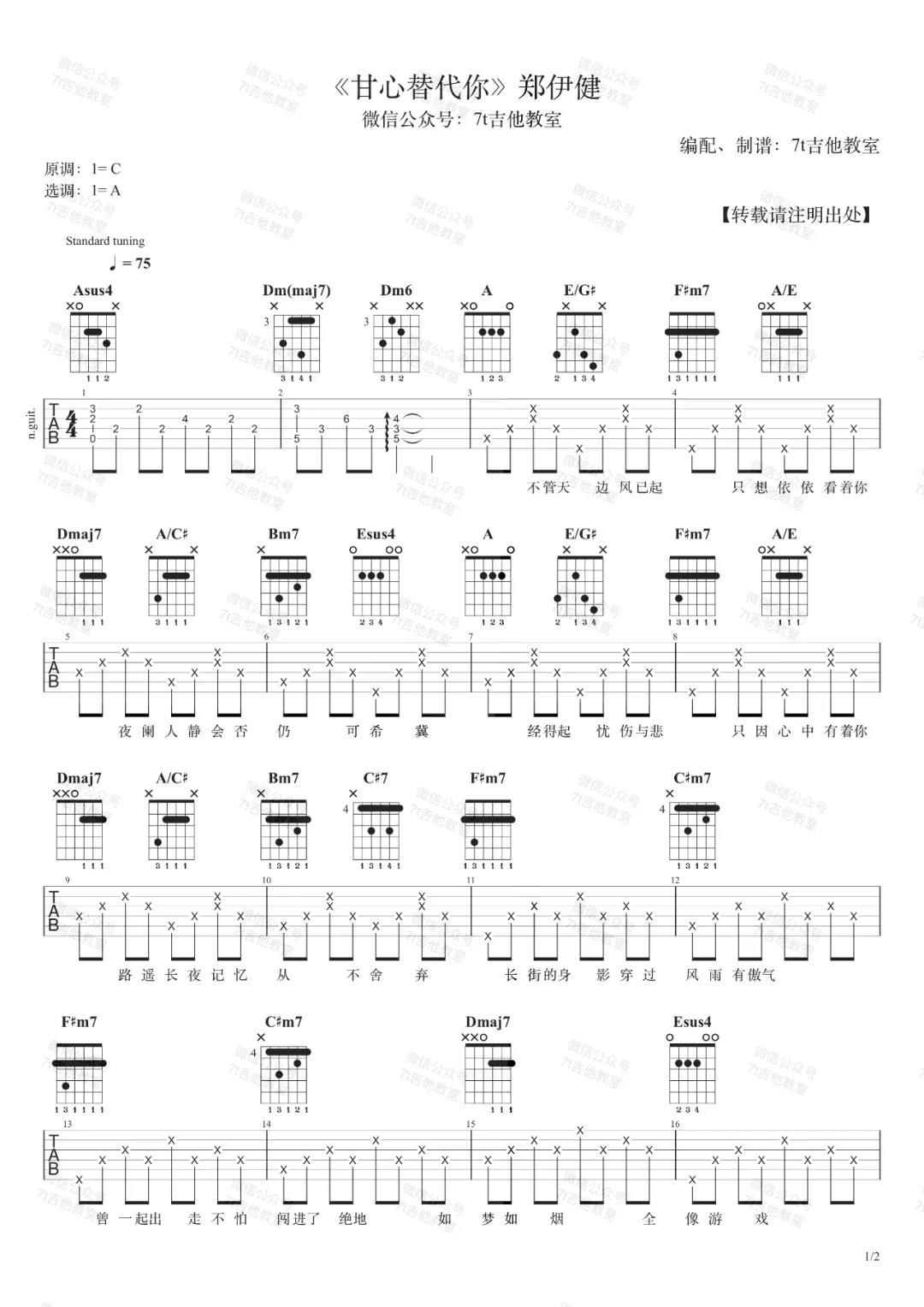 曲谱介绍: 郑伊健《甘心替代你》吉他弹唱谱,采用A调指法编配,共有2张高清图谱,免翻页排版设计。