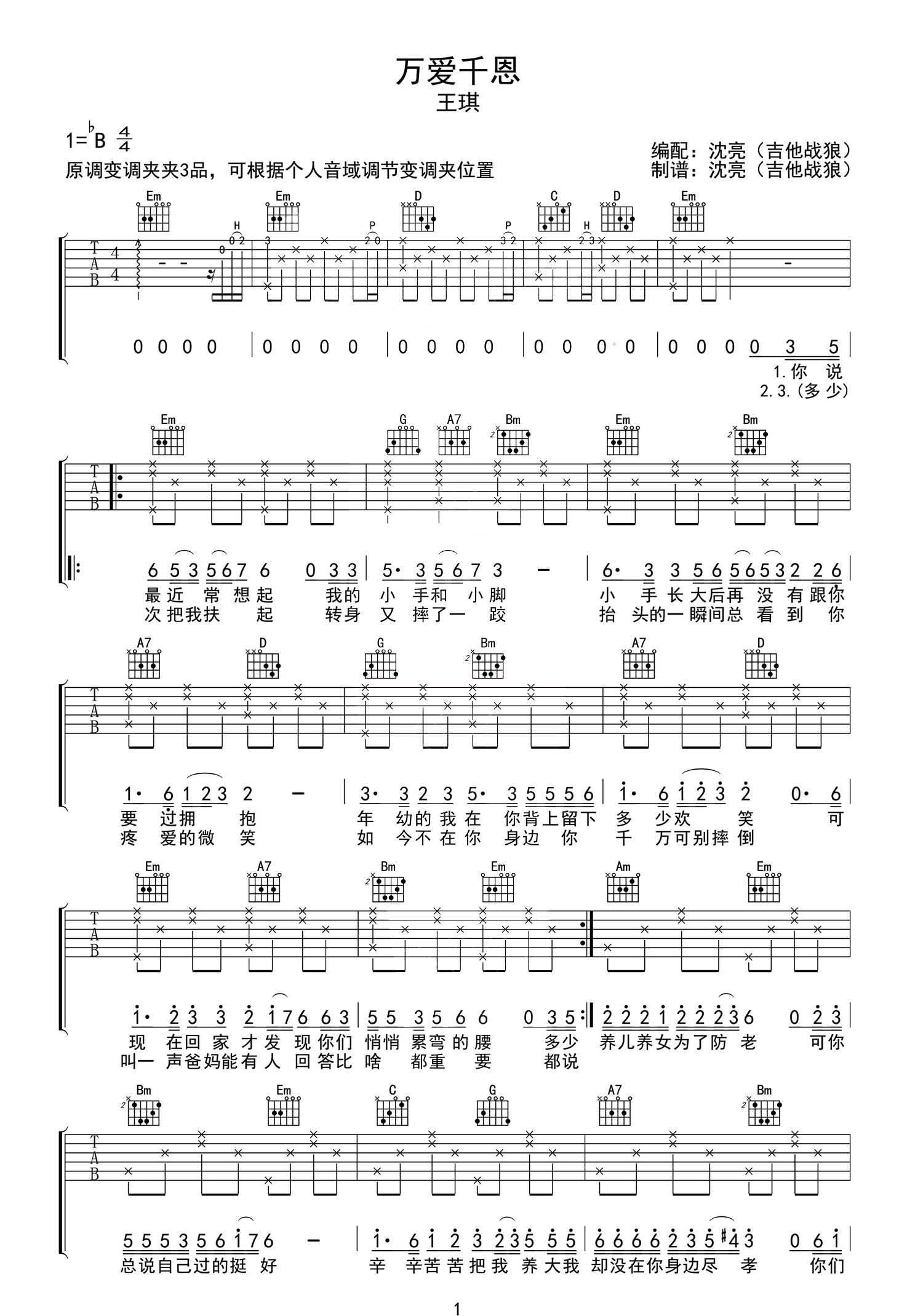 曲谱介绍: 王琪《万爱千恩》吉他谱_G调吉他弹唱谱