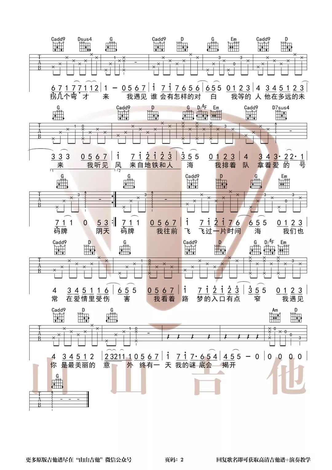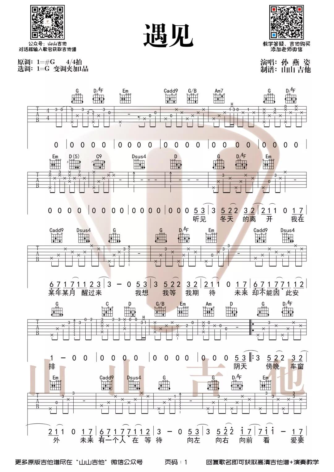 曲谱介绍: 孙燕姿《遇见》吉他弹唱谱,采用G调指法编配,共有2张高清图谱,免翻页排版设计。