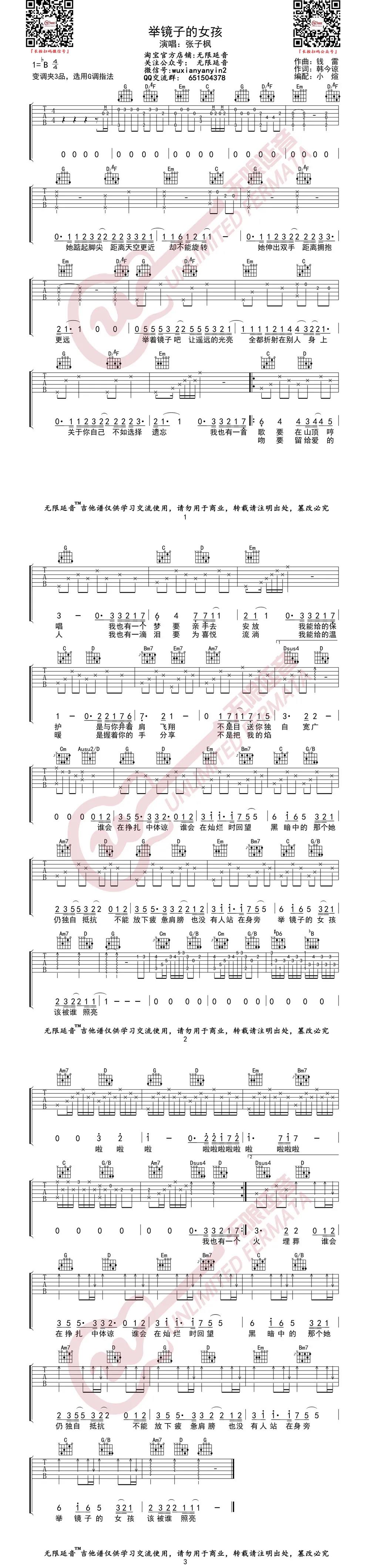 曲谱介绍: 张子枫《举镜子的女孩》吉他弹唱谱,采用G调指法编配,共有1张高清图谱,免翻页排版设计。