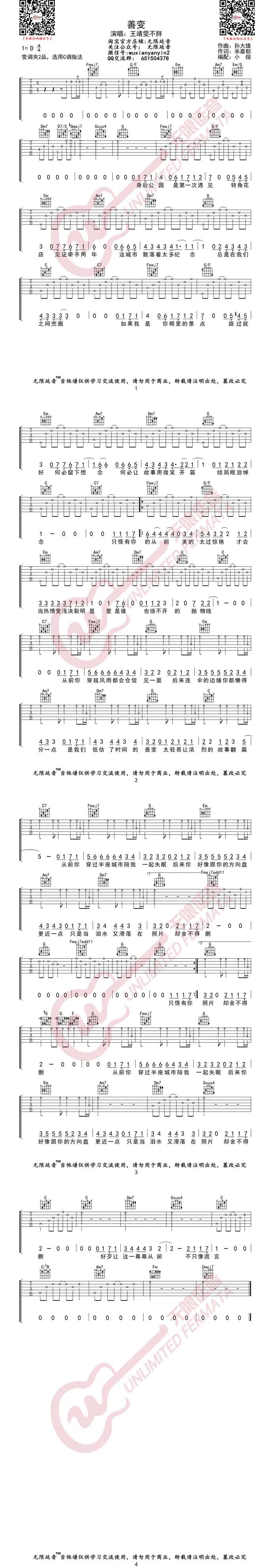 善变吉他谱 - 王靖雯不胖 - D调吉他弹唱谱