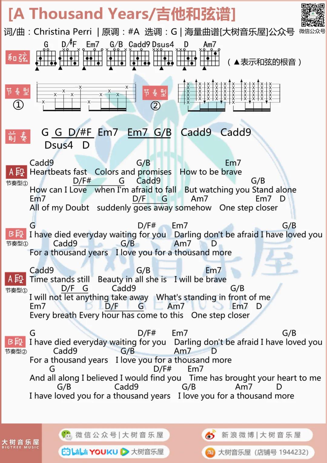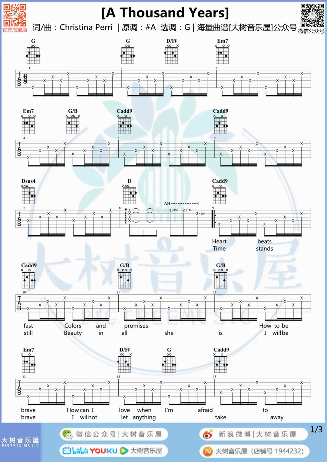 曲谱介绍: Christina,Perri《AThousandYears》吉他弹唱谱,采用G调指法编配,共有4张高清图谱。