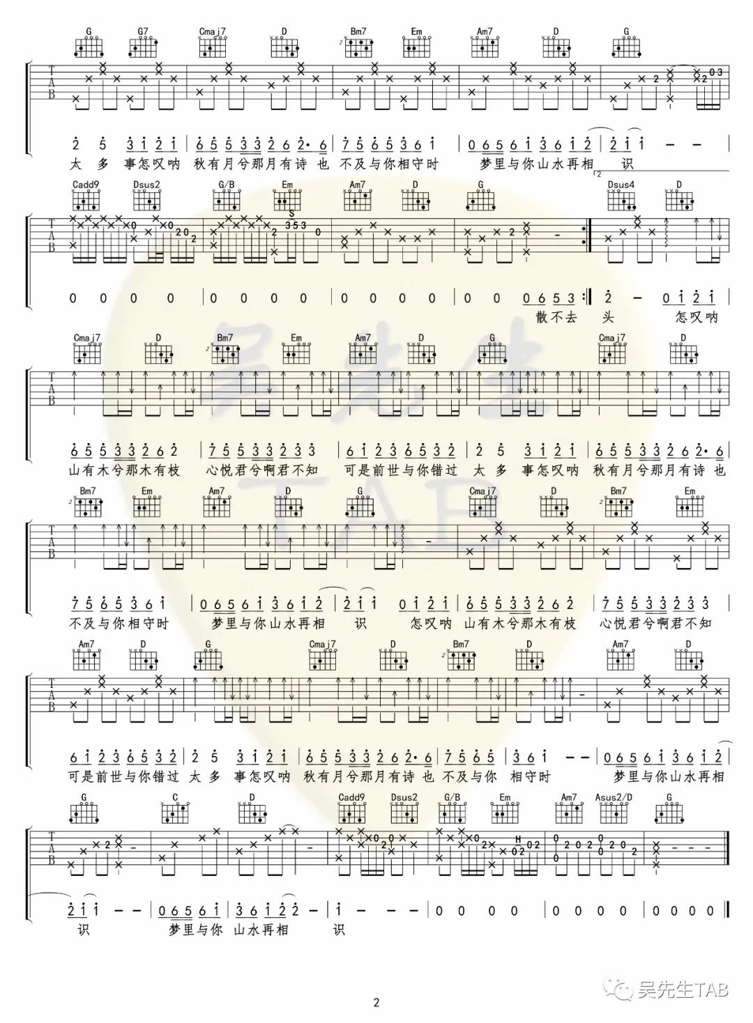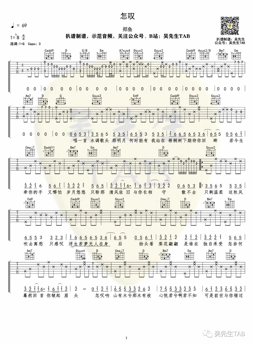 曲谱介绍: 郑鱼,国风新语《怎叹》吉他弹唱谱,采用G调指法编配,共有2张高清图谱,免翻页排版设计。