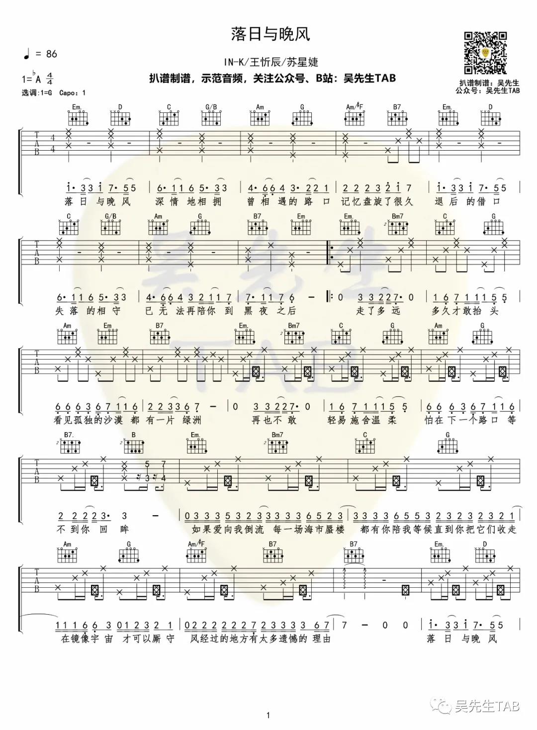 落日与晚风吉他谱 - 王忻辰,苏星婕 - G调吉他弹唱谱