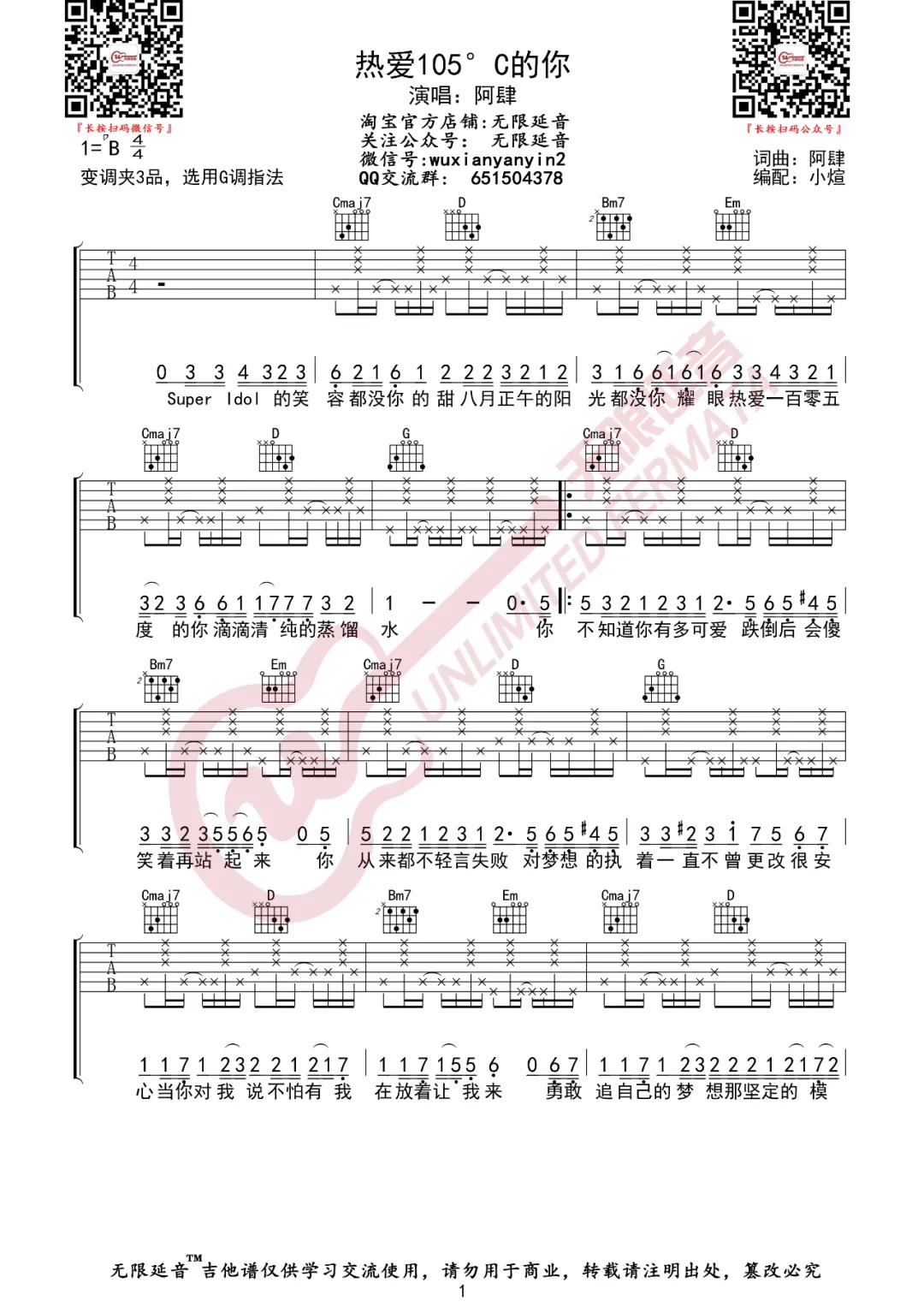 曲谱介绍: 《热爱105°C的你》是某个品牌和阿肆致敬热爱精神的作品。这首歌发行于2019年7月4日,由阿肆作词作曲,她用比100°C还要多5°C的热爱做走心音乐。热爱的精神蕴含巨大的能量,致敬热爱,鼓励心怀满腔热爱的人创造不可能。