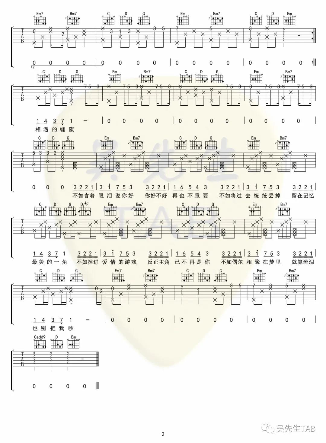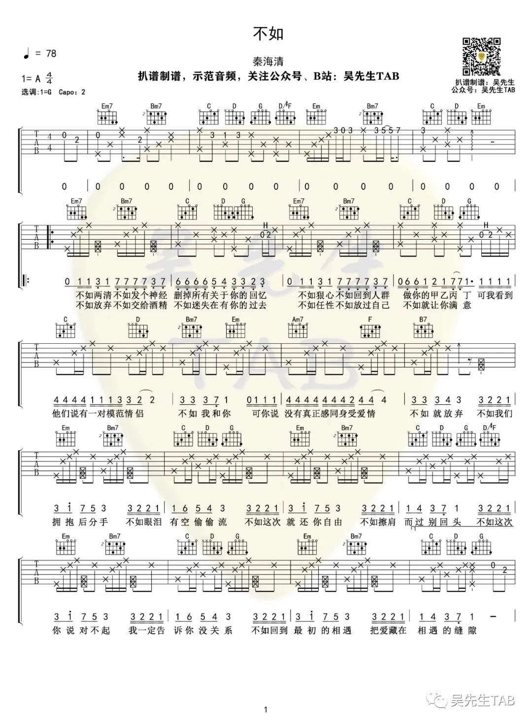 曲谱介绍: 秦海清《不如》吉他弹唱谱,采用G调指法编配,共有2张高清图谱,免翻页排版设计。