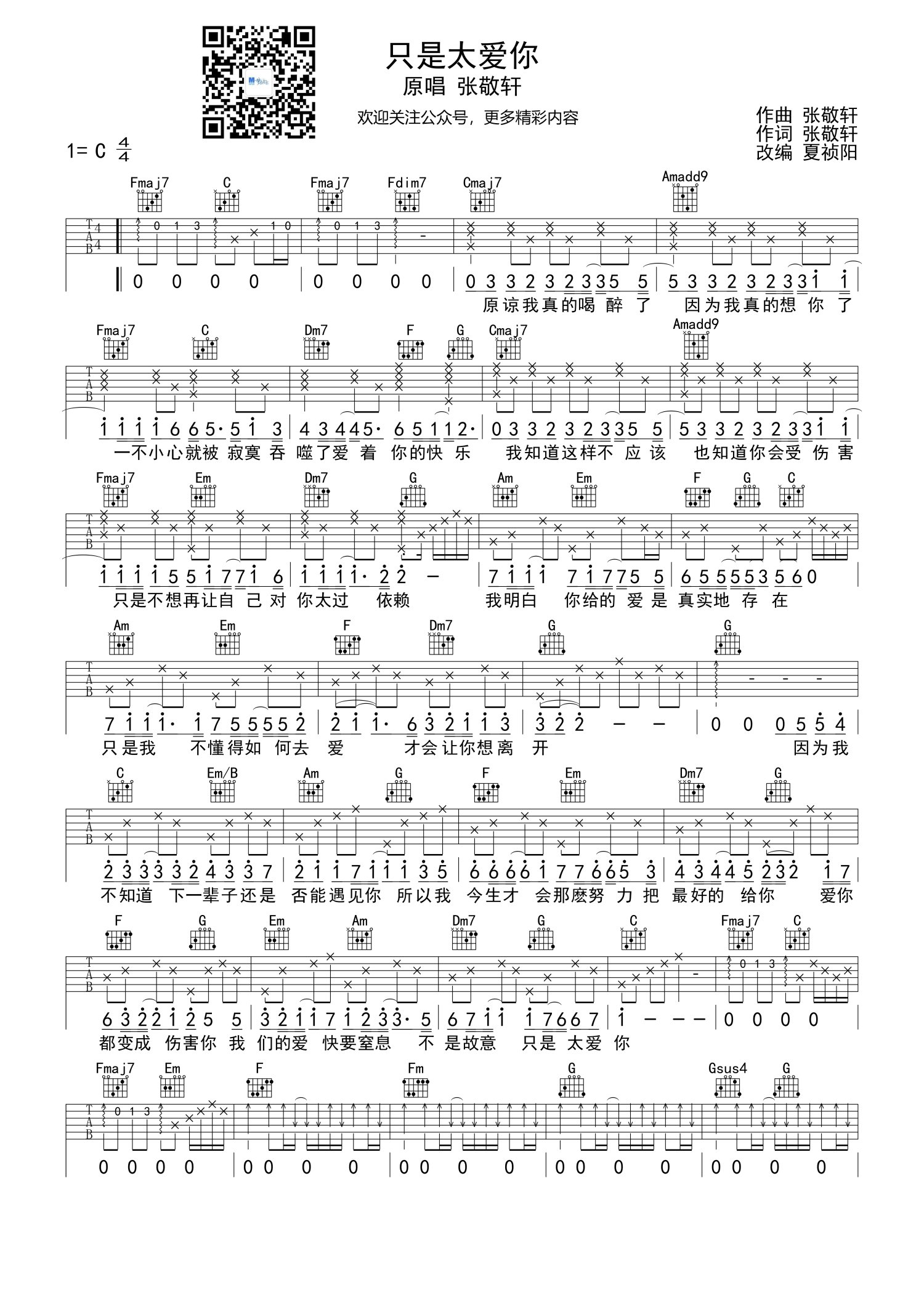曲谱介绍: 张敬轩《只是太爱你》吉他谱_C调吉他弹唱谱