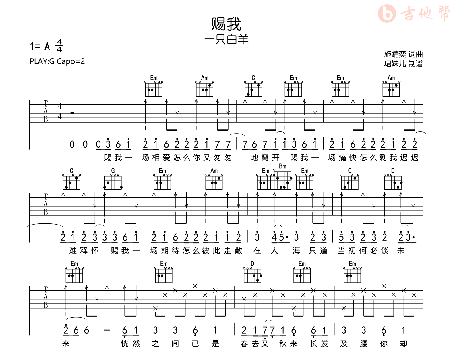 赐我吉他谱 - 一只白羊 - G调吉他弹唱谱