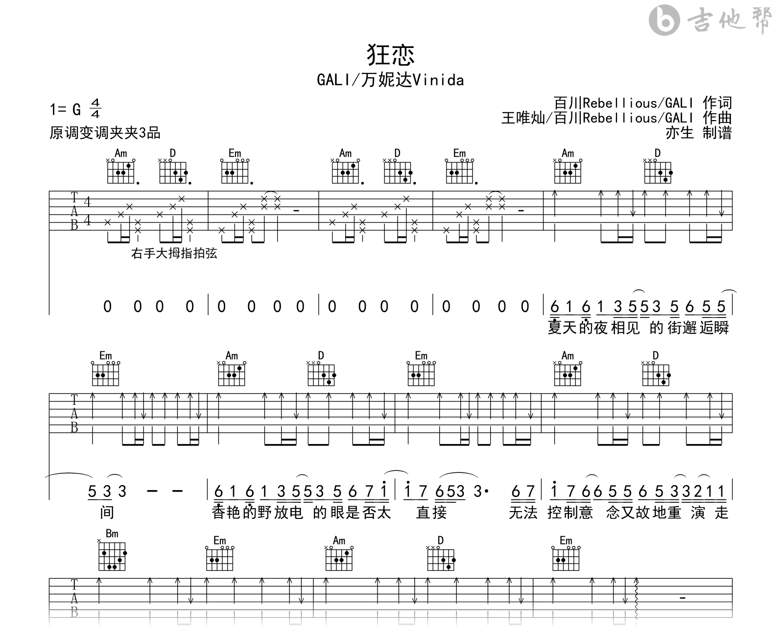 曲谱介绍: 狂恋吉他谱,GALI/万妮达Vinida演唱,一首极致浪漫歌歌曲。《狂恋》吉他六线谱,采用G调和弦指法,推荐变调夹夹3品,节奏4/4拍,速度大概每分钟95拍,整体难度简单。 如夏天的风一般,挑拨我们的心房。Vinida和Gali声线真绝配,单曲循环N天不停歇。希望每一个人都能狂恋生活,肆意快活的尽情绽放着起来。