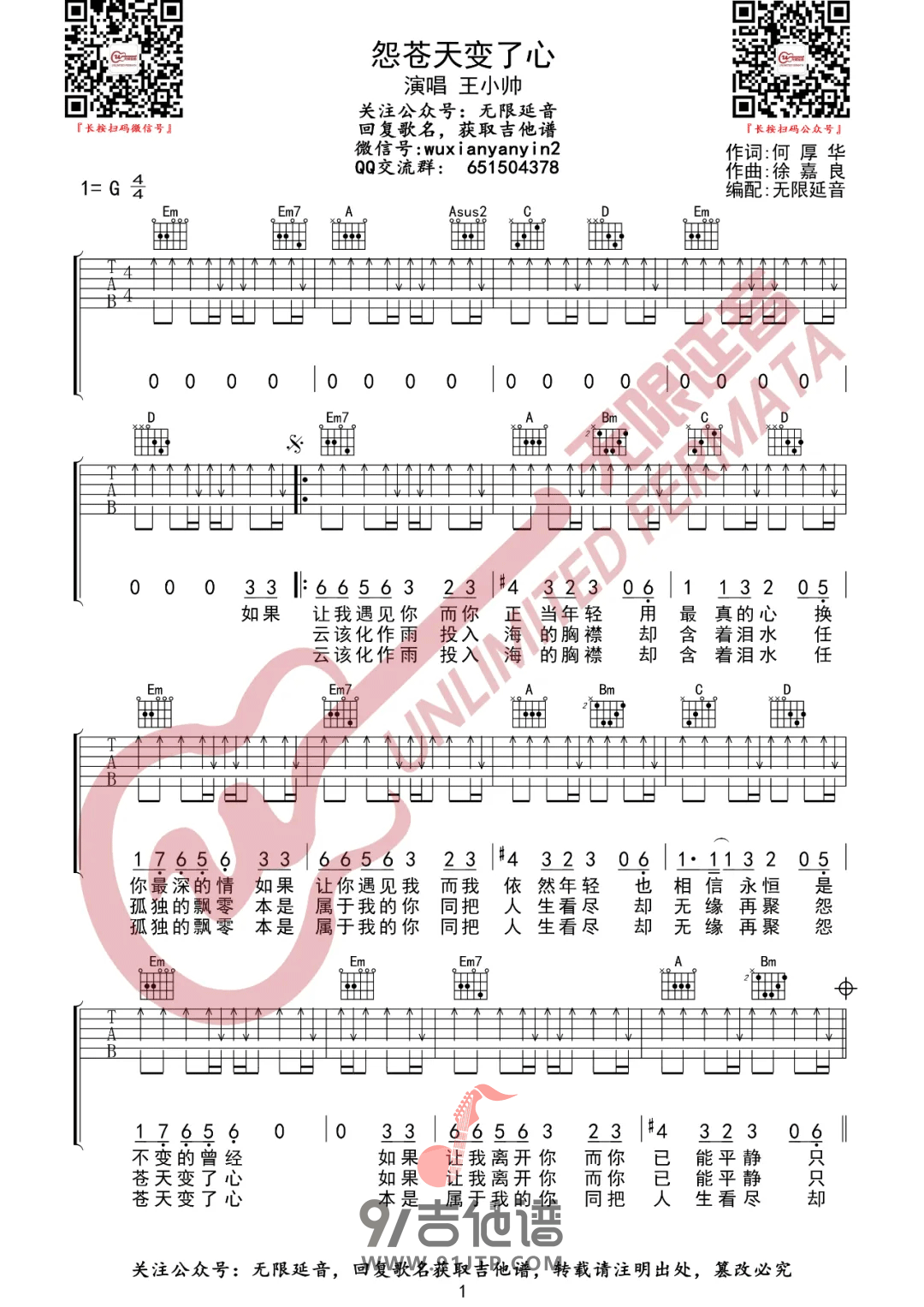 曲谱介绍: 《怨苍天变了心》吉他谱_王小帅_G调弹唱谱_高清六线谱分享,《怨苍天变了心》是由王小帅演唱的一首歌曲,旧时的旋律可以有新的演绎,过去的故事都是成长的经历。不一样的时空、不一样的方式,小帅以清新自然的声音、清澈且独特,在年轻的力量和岁月交错里,诠释出歌曲不同的味道和意境。歌曲采用G调指法进行编配,全谱都为扫弦节奏型,比较简单。