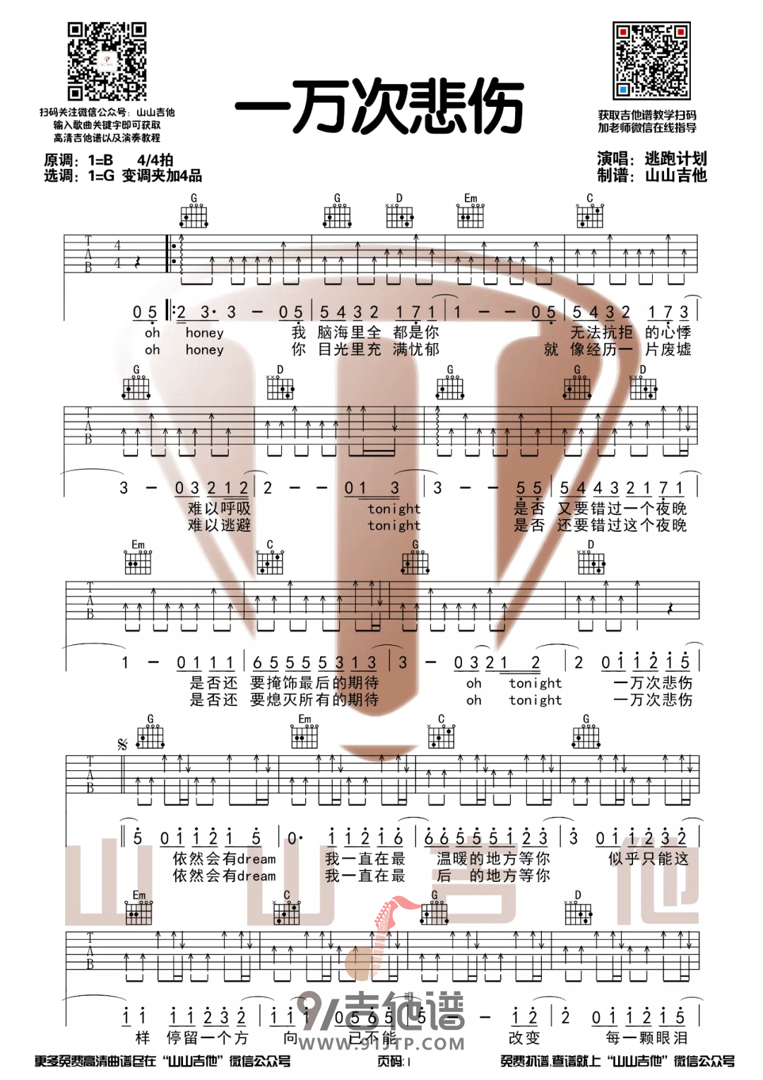 曲谱介绍: 《一万次悲伤》吉他谱_逃跑计划_G调弹唱谱_高清六线谱分享,《一万次悲伤》是由毛川、李赤作词,逃跑计划乐队作曲并演唱的一首歌曲,毛川飒爽的吉他扫弦,令耳朵一亮,歌词通俗易懂,没有华丽的辞藻,直接唱出的是歌者最真挚最生活的话语。歌曲写的是一位为心中挚爱甘愿承担悲伤的男子,无论是历经一千次,或者是一万次的悲伤,都愿意在最初最美的地方等待,愿意历经重重艰苦也要找到你,都要化解眼中的忧郁。