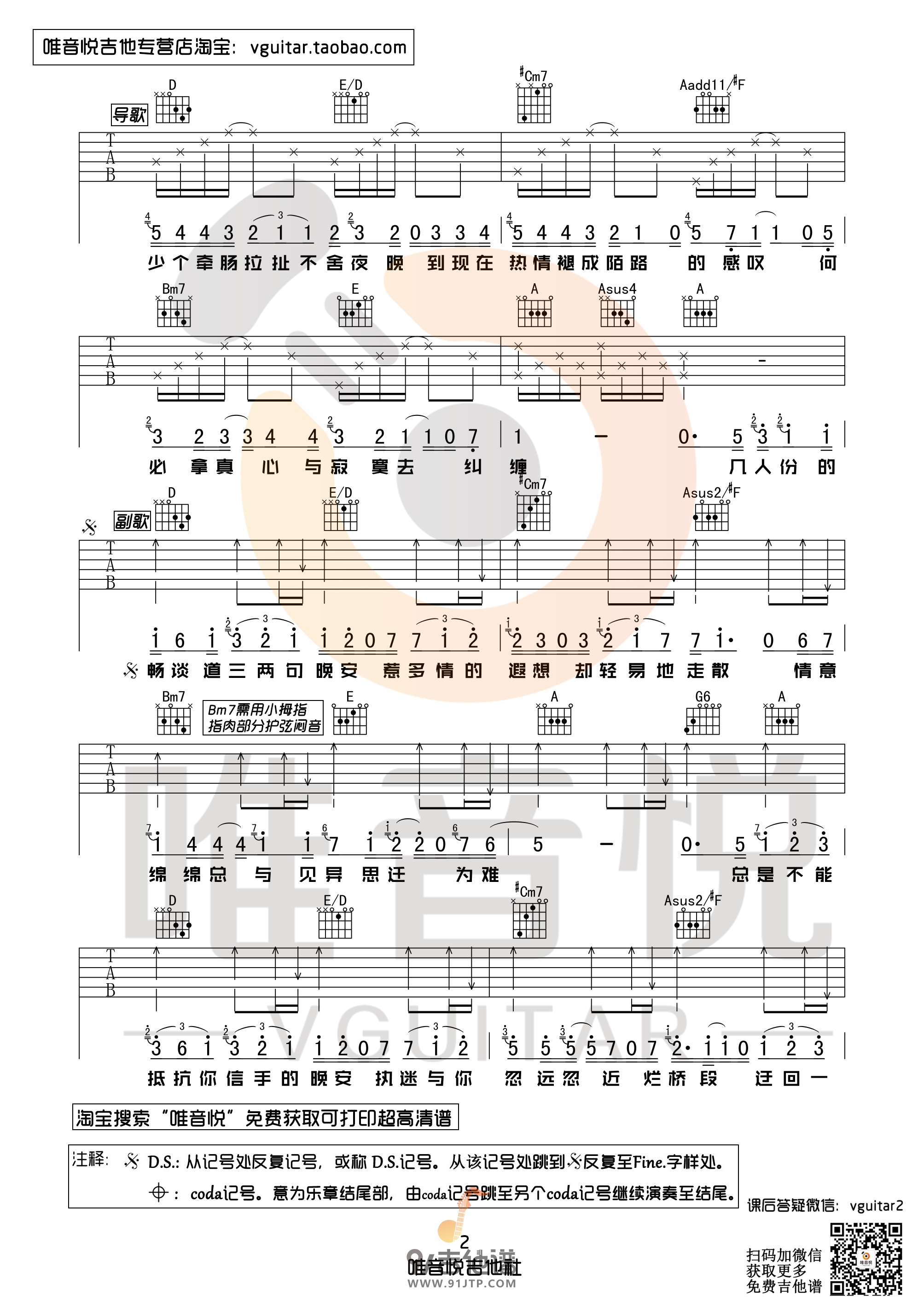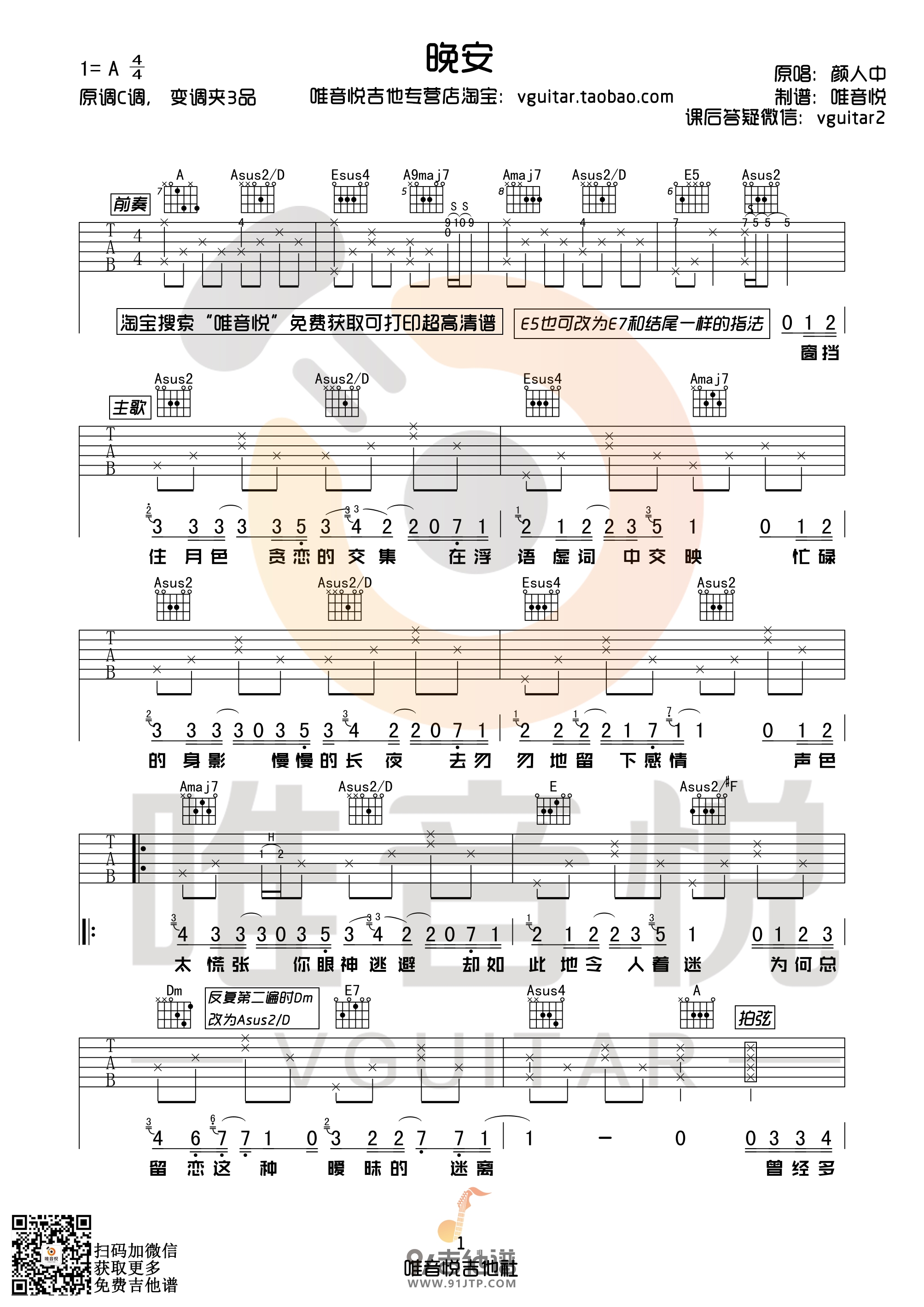 曲谱介绍: Guitar《晚安》吉他弹唱谱,采用A调指法编配,共有2张高清图谱,免翻页排版设计。