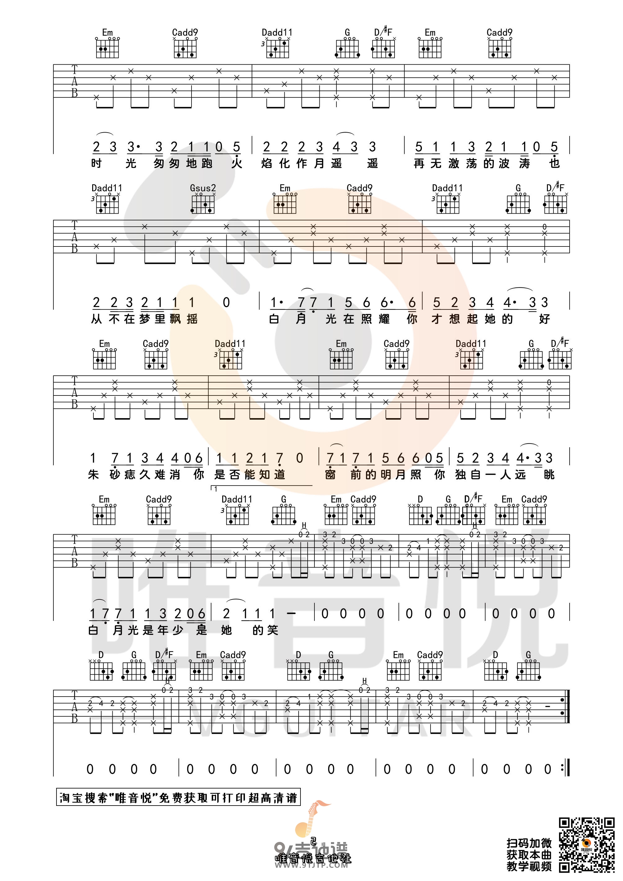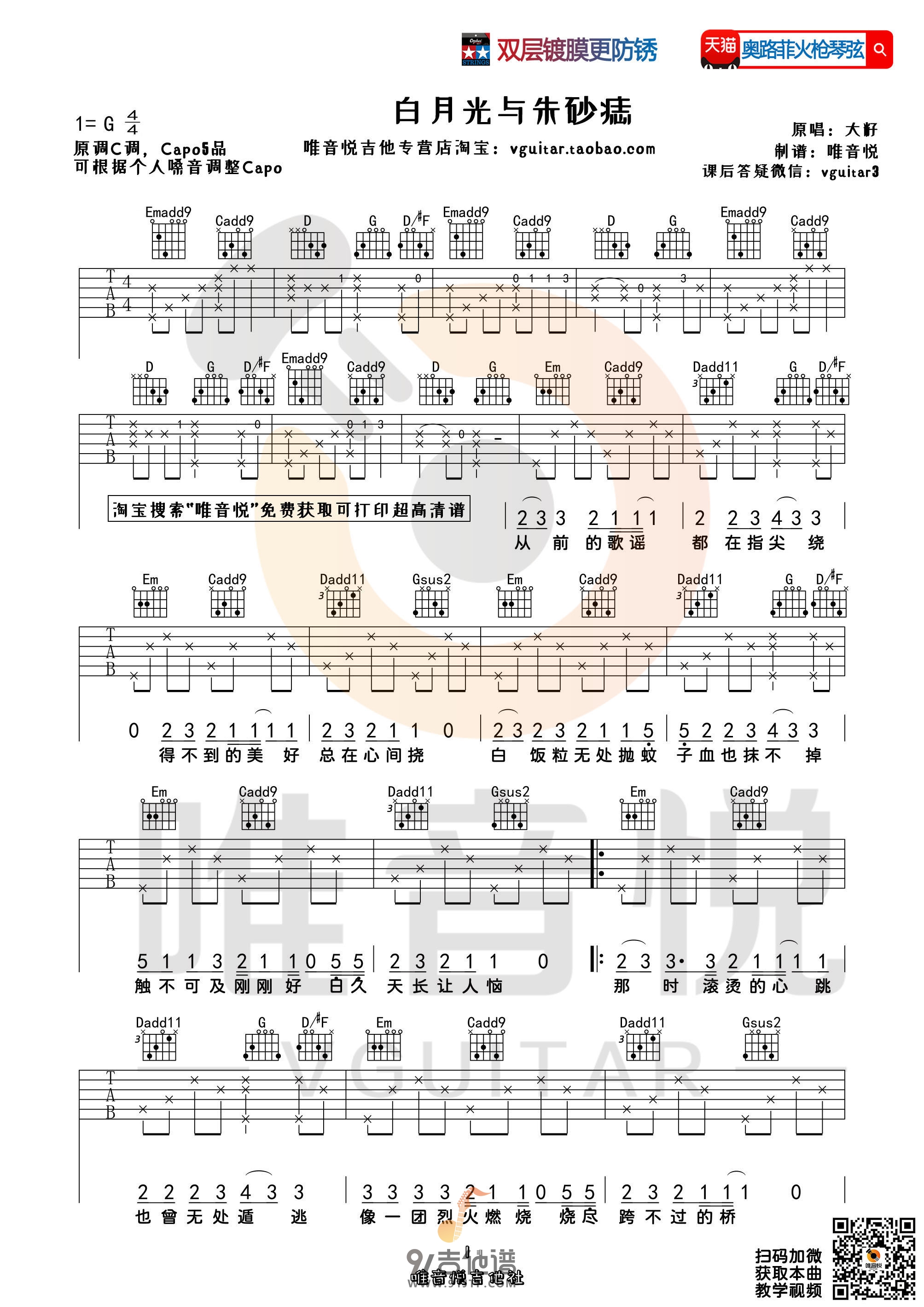 曲谱介绍: Guitar《白月光与朱砂痣》吉他弹唱谱,采用G调指法编配,共有3张高清图谱。