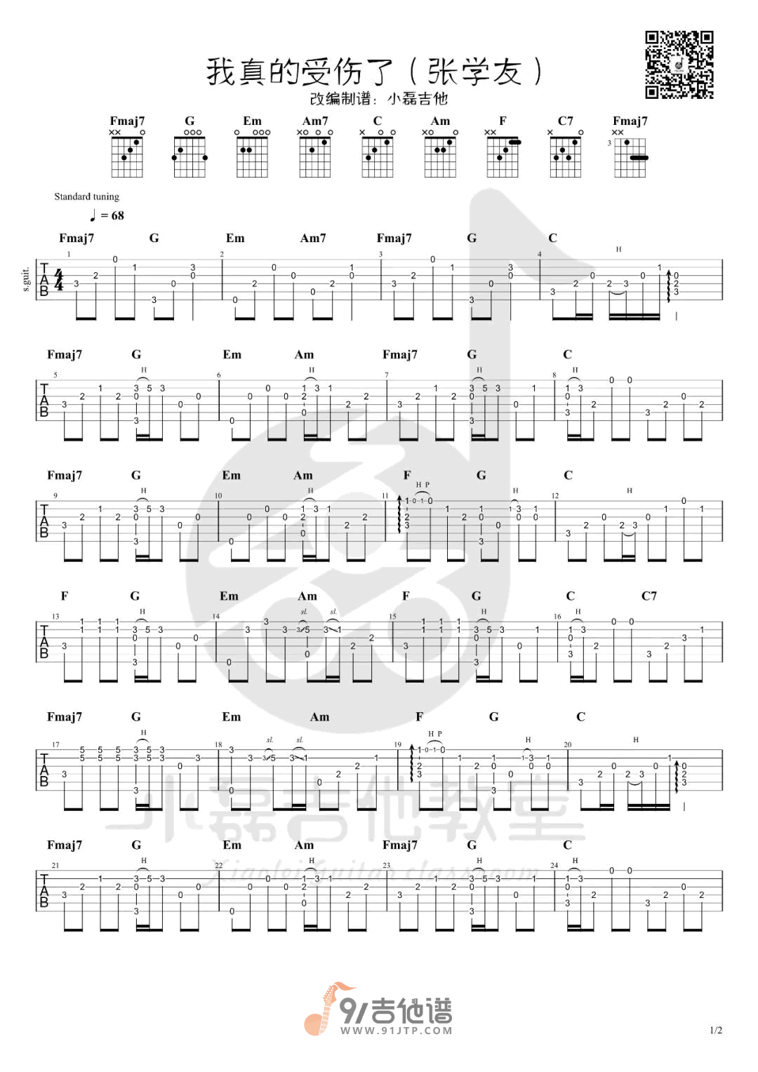 曲谱介绍: 《我真的受伤了》是由歌神张学友演唱的一首经典情歌,对于我们这一代80后来说,港台歌手对我们的音乐审美的培养起到了根本的作用,当然提到港台音乐,歌神张学友自然是浓厚的一笔。这首《我真的受伤了》其实也不算一首老歌,旋律简单清晰,段落不复杂,老师改编的这个版本的指弹乐谱也是尽可能降低了难度,其实也是C调常见的和弦编排方式,整体难度不高。