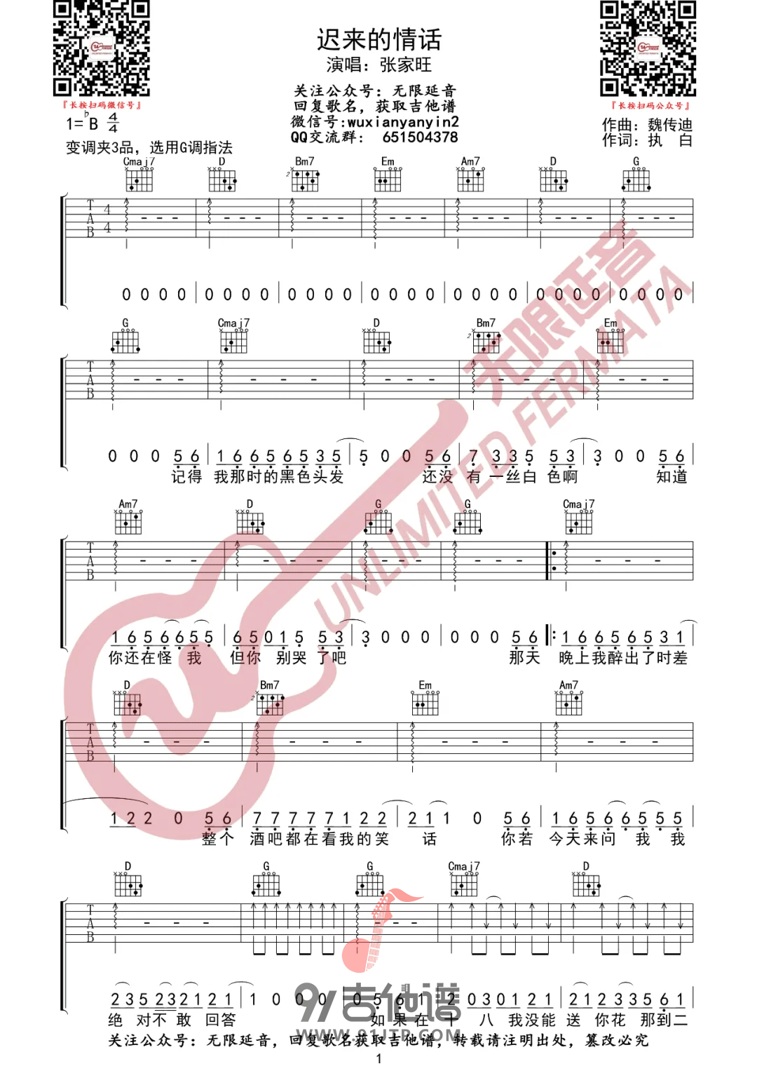 迟来的情话吉他谱 - 张家旺 - G调吉他弹唱谱