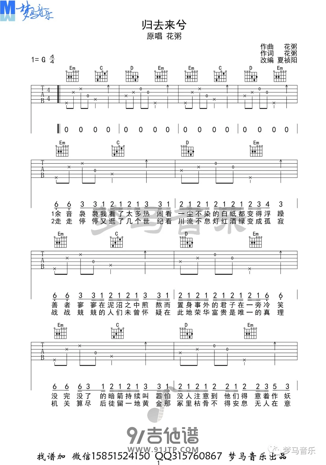 归去来兮吉他谱 - 花粥 - G调吉他弹唱谱